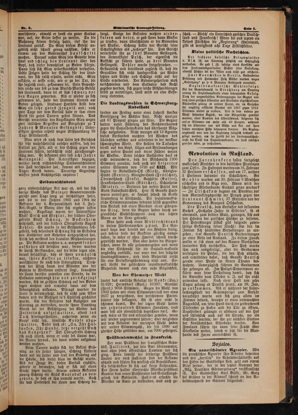 Den Zarenhenkern fallen fortgesetzt massenhaft Menschen in den baltischen Provinzen zum Opfer. In Hasenpot wurden am 16. Februar 32 Personen erschossen, und am 17. weitere 3 Personen darunter ein Schullehrer. Bei Grobin wurden am 20. Februar 8 Menschen erschossen und in Riga vier. Wann wird der schuftigen Mörderbande Einhalt getan werden? — In Otschakow begann am Dienstag vor dem Marinekriegsgericht der Prozeß gegen den Leutnant Schmidt, 37 Matrosen von der Bemannung des Kreuzers Otschakow.