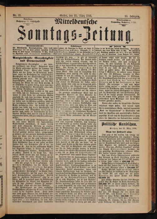 Die Mitteldentsche Sonntags⸗Zeitung kostet durch unsere gehmen alle Austräger in Stadt und Land, di, Austräger frei ins Haus geliefert monatlich 25 Pfennig. Expedition in Gießen, Rittergasse 17, die Durch die Post bezogen vierteljährlich 75 Pfg. Direkt durch Druckerei, Ludwigstr. 30, jede Postanstalt nnd die Expedition unter Kreuzband dierteljährlich 1 Mark. jeder Landbriefträger entgegen.(P.⸗Z. K. 5107)