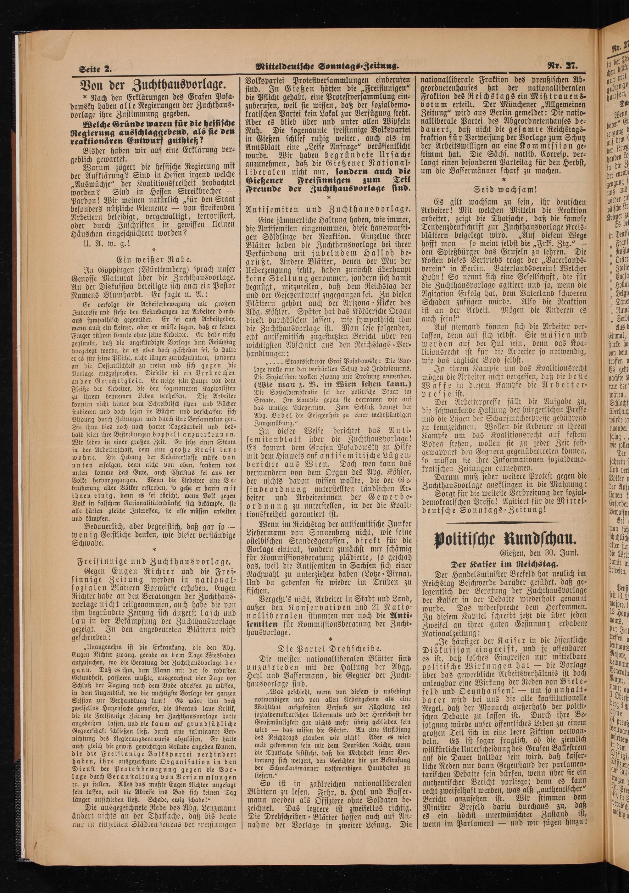 Wenn im Reichstag der antisemitische Junker Liebermann von Sonnenberg nicht, wie seine ostelbischen Standesgenossen, direkt für die Vorlage eintrat, sondern zunächst nur schämig für Kommissionsberatung plädierte, so geschah das, weil die Antisemiten in Sachsen sich einer Nachwahl zu unterziehen haben(Lotze-Pirna). Und da gedenken sie wieder im Trüben zu fischen.