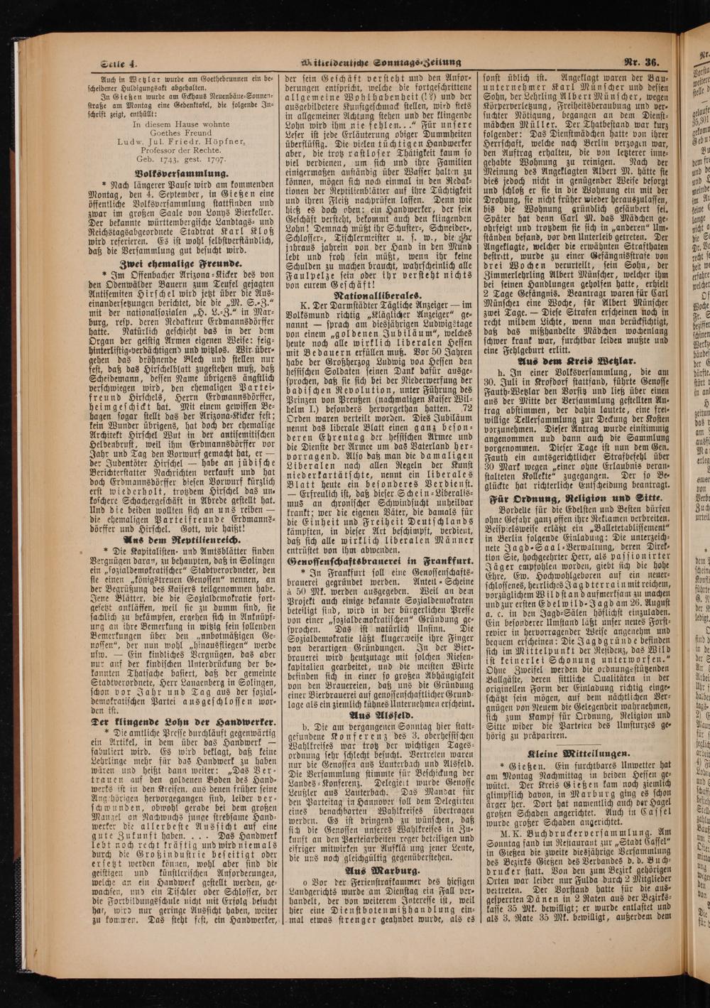 * Nach längerer Pause wird am kommenden Montag, den 4. September, in Gießen eine öffentliche Volksversammlung stattfinden und zwar im großen Saale von Lonys Bierkeller. Der bekannte württembergische Landtags- und Reichstagsabgeordnete Stadtrat Karl Kloß wird referieren. Es ist wohl selbstverständlich, daß die Versammlung gut besucht wird.