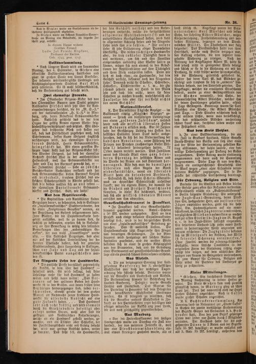 der sein Geschäft versteht und den Anfor⸗ derungen entspricht, welche die fortgeschrittene allgemeine Wohlhabenheit(19) und der ausgebildetere Kunstgeschmack stellen, wird stets in allgemeiner Achtung stehen und der klingende Lohn wird ihm nie fehlen...“ Für unsere Leser ist jede Erläuterung obiger Dummheiten überflüssig. Die vielen tüchtigen Handwerker aber, die trotz rastloser Thätigkeit kaum so viel verdienen, um sich und ihre Familien einigermaßen anständig über Wasser halten zu können, mögen sich noch einmal in den Redak⸗ tionen der Reptilienblätter auf ihre Tüchtigkeit und ihren Fleiß nachprüfen lassen. Denn wie hieß es doch oben: ein Handwerker, der sein Geschäft versteht, bekommt auch den klingenden Lohn! Demnach müßt ihr Schuster-, Schneider⸗, Schlosser⸗, Tischlermeister u. s. w., die hr jahraus jahrein von der Hand in den Mund lebt und froh sein müßt, wenn ihr keine Schulden zu machen braucht, wahrscheinlich alle Faulpelze sein oder ihr versteht nichts von eurem Geschäft! Nationalliberales.