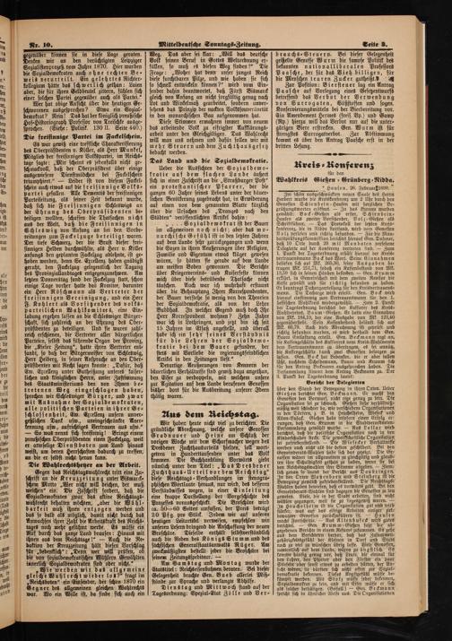 über den Stand der Bewegung in ihren Orten. Ueber Gießen berichtet Gen. Beckmann. Er macht den Genossen den Vorwurf, nicht rege genug zu sein. Die Organisation sei zu schwach. Gießen stehe verhältniß⸗ mäßig weit schlechter da, wie verschiedene Organisationen in den Dörfern, z. B. in Heuchelheim, Wieseck und Alten⸗Buseck. Gießen habe insofern einen Erfolg er⸗ rungen, daß Gen. Krumm in die Stadtverordneten⸗ Versammlung gewählt wurde.— Aus Lollar wird berichtet, daß die politische Organisation noch in den Kinderschuhen stecke. Die gewerkschaftliche Organisation sei zufriedenstellend.— Die Wiesecker Verhältnisse werden auch nicht als die besten geschildert. Bei den Gemeinderats⸗Wahlen habe sich das gezeigt. Die Ge⸗ nossen wären im allgemeinen zu gleichgiltig und glaub⸗ ten ihre Schuldigkeit gethan zu haben, wenn sie bei den Reichstagswahlen ihre Stimme abgeben.— Ziem⸗ lich genau so lautet der Bericht aus Daubring en. In den Orten Watzenborn und Steinberg ist die Bewegung ziemlich zufriedenstellend. Die Reichstags⸗ Wahlen haben bewiesen, daß es vorwärts geht. Bei den Gemeinderats⸗Wahlen sind dagegen die Genossen zu lau gewesen. Viele, die in der Stadt arbeiten, sind nicht wählen gegangen, weil sie zu siegesgewiß waren.— In Heuchelheim ist die Organisation gut und wird stärker, was auf das eifrige Arbeiten einiger ziel⸗ bewußter Genossen zurückzuführen ist.— Hausen macht Fortschritte.— Aus Altenbuseck wird gutes berichtet.— Gen. Krumm ⸗Gießen faßt die ab⸗ gegebenen Berichte in einem Resume zusammen. Es gehe aus dem Berichteten hervor, daß das Zusammen⸗ gehörigkeitsgefühl der Kleinen in Dorf und Stadt noch zu viel zu wünschen übrig lasse. Viele Genossen, namentlich auf dem Lande, wären zu ängstlich. Es komme häufig genug vor, daß Leute, die einmal für den Lehrer, den Pfarrer oder den Förster ein paar Stiefeln oder sonst etwas zu arbeiten hätten, der An⸗ sicht wären, sie dürften sich nicht offen zur Sozial⸗ demokratie bekennen. Dieses Angstgefühl müsse be⸗ kämpft werden. Mit Stolz müsse jeder bekennen, Sozialdemokrat zu sein, und mit Eifer müsse er sich als solcher bethätigen.(Beifall.)— Gen. Beckmann spricht sich in ähnlicher Weise aus. Die Organisationen