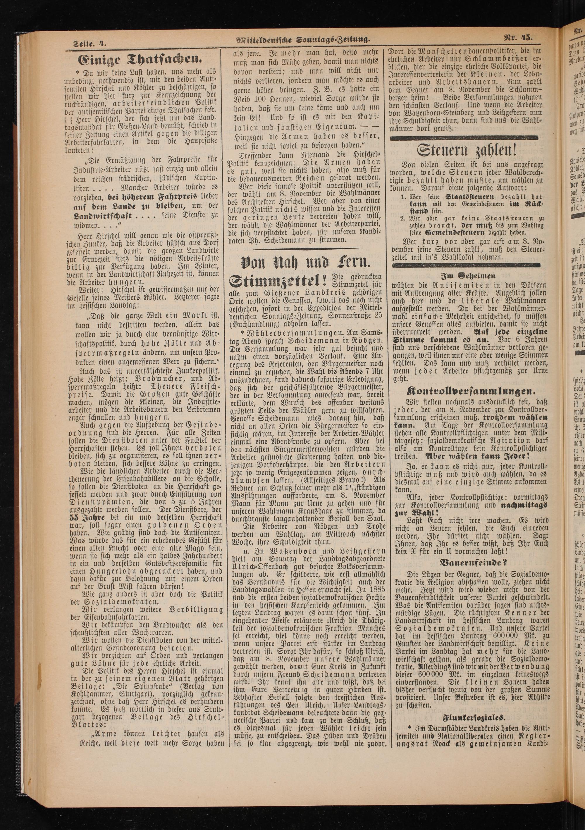 „Da wir keine Lust haben, uns mehr als unbedingt nothwendig ist, mit den beiden Anti⸗ semiten Hirschel und Köhler zu beschäftigen, so stellen wir hier kurz zur Kennzeichnung der rückständigen, arbeiter feindlichen Politik der antisemitischen Partei einige Thatsachen fest. Herr Hirschel, der sich jetzt um das Land⸗ tagsmandat für Gießen⸗Land bemüht, schrieb in seiner Zeitung einen Artikel gegen die billigen Arbeiterfahrkarten, in dem die Hauptsätze lauteten: