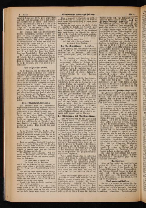 „Was den Kampf gegen den Umsturz be— trifft, so haben die Konservativen die meisten Bestimmungen des in der vorigen Session im Reichstag eingebrachten Entwurfs ebenso skeptisch aufgenommen, wie wir und unsere Gesinnungsgenossen; sie machen allerdings viel Wesens davon, daß sie die einer sorg⸗ fältigen Prüfung werten Vorschläge zur Aus⸗ gestaltung des§ 153 der Gewerbe-Ordnung einer solchen unterziehen wollten, während ein Teil der Nationalliberalen, im Gegensatz zu der von uns vertretenen Ansicht, dies für überflüssig hielt. Der Unterschied war, im Hinblick auf die ablehnende Haltung des Centrums— mehr taktischer als sach⸗ licher Art, und die von uns nicht gebilligte Taktik beruhte, wie wir alsbald hervorge⸗ hoben, auf ungenügender Würdigung der norddeutschen, insonderheit preußischen Ver⸗ hältnisse seitens einiger nationalliberaler Wort⸗ führer aus den süddeutschen Klcinstaaten. Wir hegen keinen Zweifel, daß die zweite Beratung der Vorlage nach der Wiederaufnahme der Reichstags⸗Verhand⸗ lungen anders verlaufen wird.“
