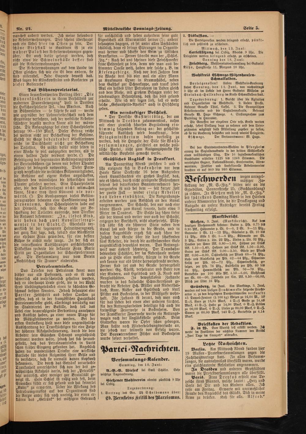 Die Parteigenossen werden dringend ersucht, pünkt⸗ lich und zahlreich zu erscheinen. Mittwoch, den 13. Juni: Cartellsitzung bei Orbig, Abends 9 Uhr. Delegirten werden dringend ersucht, zu erscheinen. Sonntag den 18. Juni: Friedberg. Wahlvereinsversammlung bei Gastwirt Kühn, Haagstraße 11, Morgens 10 Uhr.