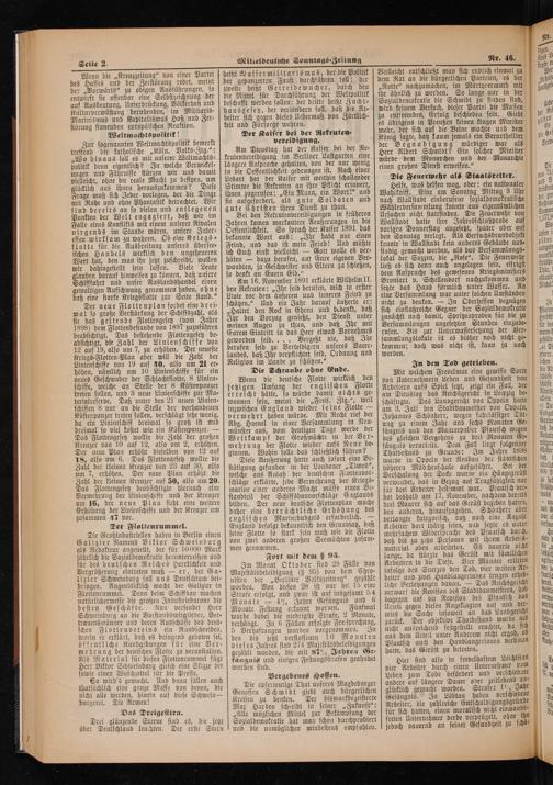 dem Rat an die bürgerlichen Parteien, es der „Rotte“ nachzumachen, im Märtyrermuth mit ihr ähnlich zu werden. So lange nur in der Sozialdemokratie die Schmidt zu finden sind, wird keinem Versuch, dieser Partei die Massen zu entfremden, Erfolg beschieden sein. Giebt es übrigens in Preußen keinen klugen Minister mehr, der sich auf die Beine machte und dem König sagte, daß kaum jemals ein Verurtheilter der Begnadigung würdiger war als Herr Albert Schmidt? Ein solcher Minister würde dem Monarchen und der Monarchie einen großen Dienst erweisen.“