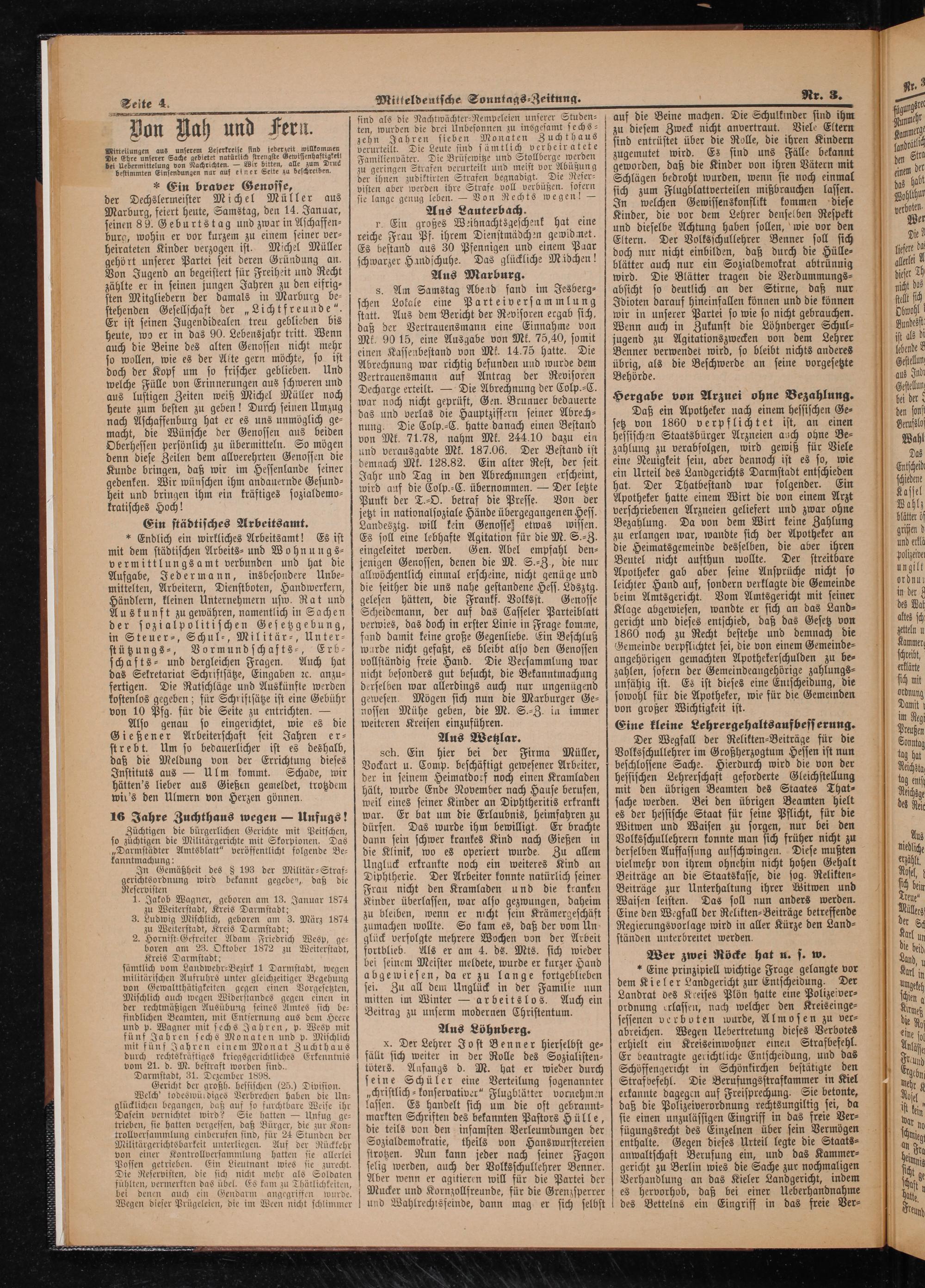 * Ein braver Genosse, der Dechslermeister Michel Müller aus Marburg, feiert heute, Samstag, den 14. Januar, seinen 89. Geburtstag und zwar in Aschaffen⸗ burg, wohin er vor kurzem zu einem seiner ver⸗ heirateten Kinder verzogen ist. Michel Müller gehört unserer Partei seit deren Gründung an. Von Jugend an begeistert für Freiheit und Recht zählte er in seinen jungen Jahren zu den eifrig⸗ sten Mitgliedern der damals in Marburg be⸗ stehenden Gesellschaft der„Lichtfreunde“. Er ist seinen Jugendidealen treu geblieben bis heute, wo er in das 90. Lebensjahr tritt. Wenn auch die Beine des alten Genossen nicht mehr so wollen, wie es der Alte gern möchte, so ist doch der Kopf um so frischer geblieben. Und welche Fülle von Erinnerungen aus schweren und aus lustigen Zeiten weiß Michel Müller noch heute zum besten zu geben! Durch seinen Umzug nach Aschaffenburg hat er es uns unmöglich ge⸗ macht, die Wünsche der Genossen aus beiden Oberhessen persönlich zu übermitteln. So mögen denn diese Zeilen dem allverehrten Genossen die Kunde bringen, daß wir im Hessenlande seiner gedenken. Wir wünschen ihm andauernde Gesund⸗ heit und bringen ihm ein kräftiges sozialdemo⸗ kratisches Hoch! Ein städtisches Arbeitsamt.
