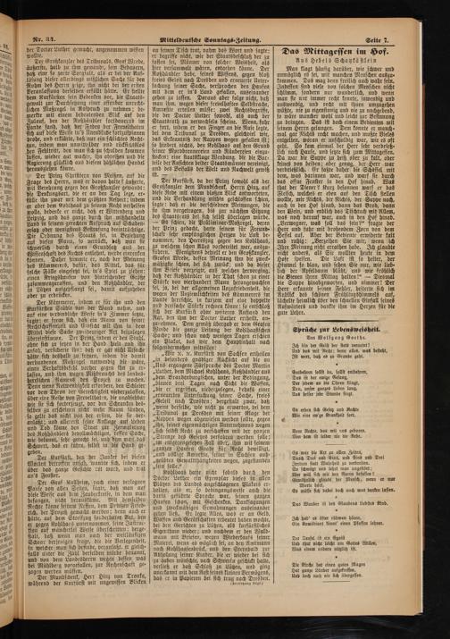 an seinen Tisch trat, nahm das Wort und sagte: er begriffe nicht, wie der Staatsbeschluß der zu fassen sei, Männer von solcher Weisheit, als hier versammelt wären, entgehen könne. Der Roßhändler habe, seines Wissens, gegen bloß freies Geleit nach Dresden und erneuerte Unter⸗ suchung seiner Sache, versprochen den Haufen mit dem er in's Land gefallen, auseinander gehen zu lassen. Daraus aber folge nicht, daß man ihm, wegen dieser frevelhaften Selbstrache, Amnestie erteilen müsse: zwei Rechtsbegriffe, die der Doctor Luther sowohl, als auch der Staatsrath zu verwechseln scheine. Wenn, fuhr er fort, indem er den Finger an die Nase legte, bei dem Tribunal zu Dresden, gleichviel wie, das Erkenntniß der Rappen wegen gefallen ist; so hindert nichts, den Kohlhaas auf den Grund seiner Mordbrennereien und Räubereien einzu⸗ stecken: eine staatskluge Wendung. die die Vor⸗ teile der Ansichten beider Staatsmänner vereinigt, fl. des Beifalls der Welt und Nachwelt gewiß ist.—