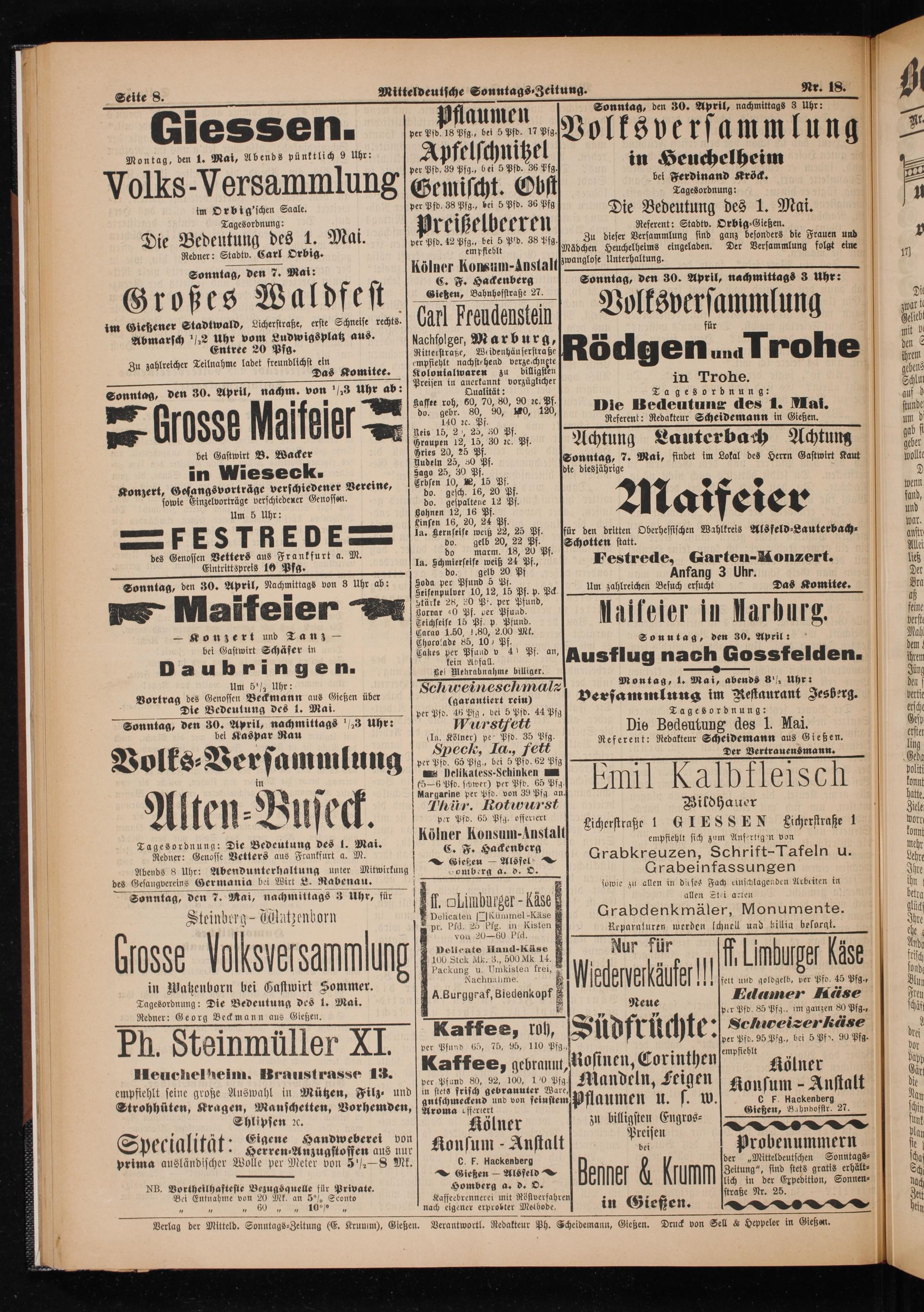 Die Bedeutung des 1. Mai. Referent: Redakteur Scheidemann in Gießen.