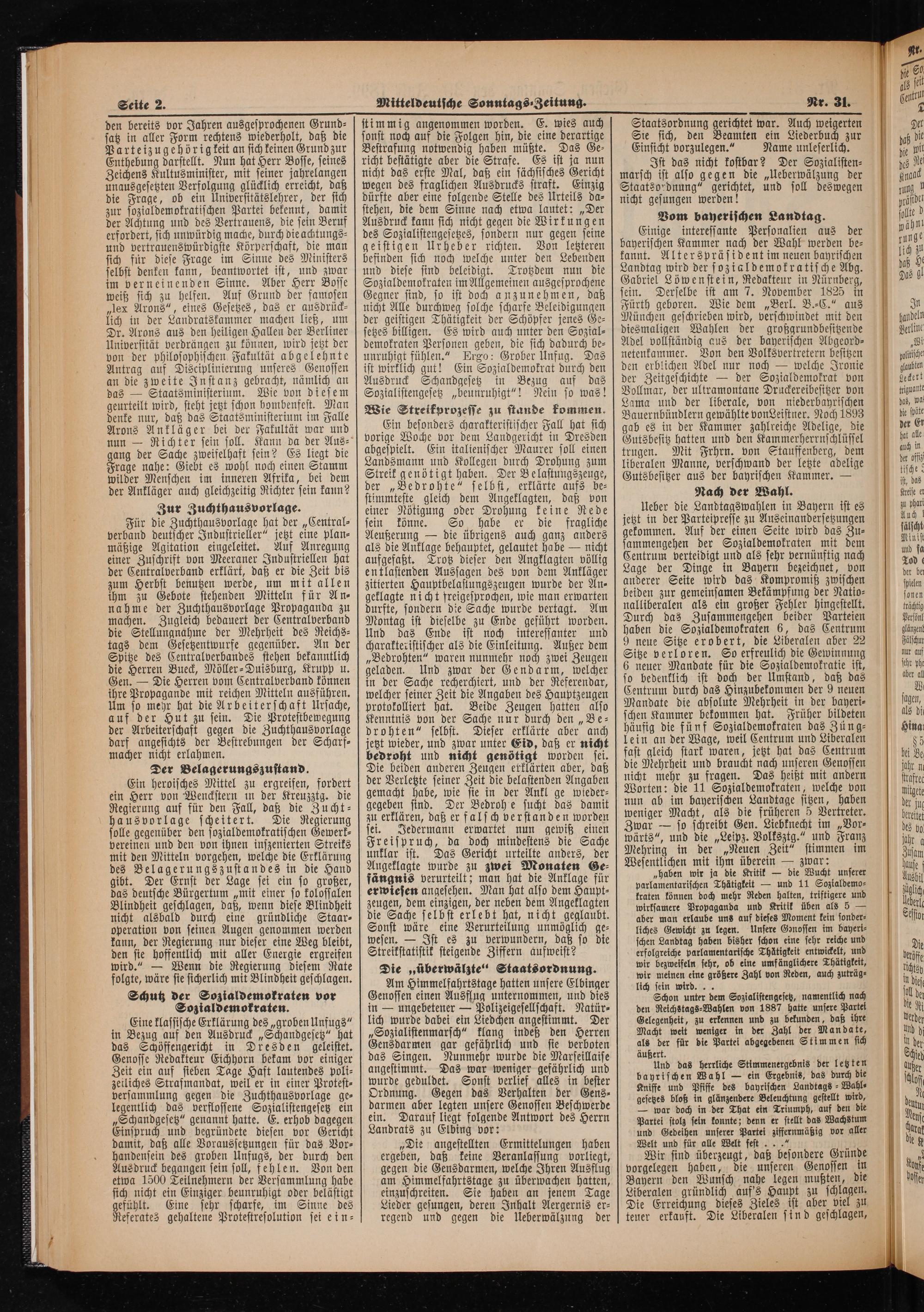 Und das herrliche Stimmenergebnis der letz ten bayrischen Wahl— ein Ergebnis, das durch die Kniffe und Pfiffe des bayrischen Landtags⸗Wahl⸗ gesetzes bloß in glänzendere Beleuchtung gestellt wird, — war doch in der That ein Triumph, auf den die Partei stolz sein konnte; denn er stellt das Wachstum und Gedeihen unserer Partei ziffernmäßig vor aller Welt und für alle Welt fest...“.