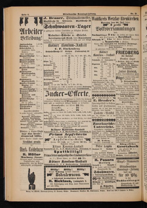 HKölner Konsum-Anstalt Bahnhofstraße 27. C. F. Hackenberg. Lindenplatz 12.