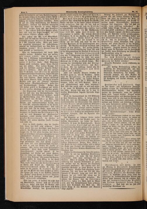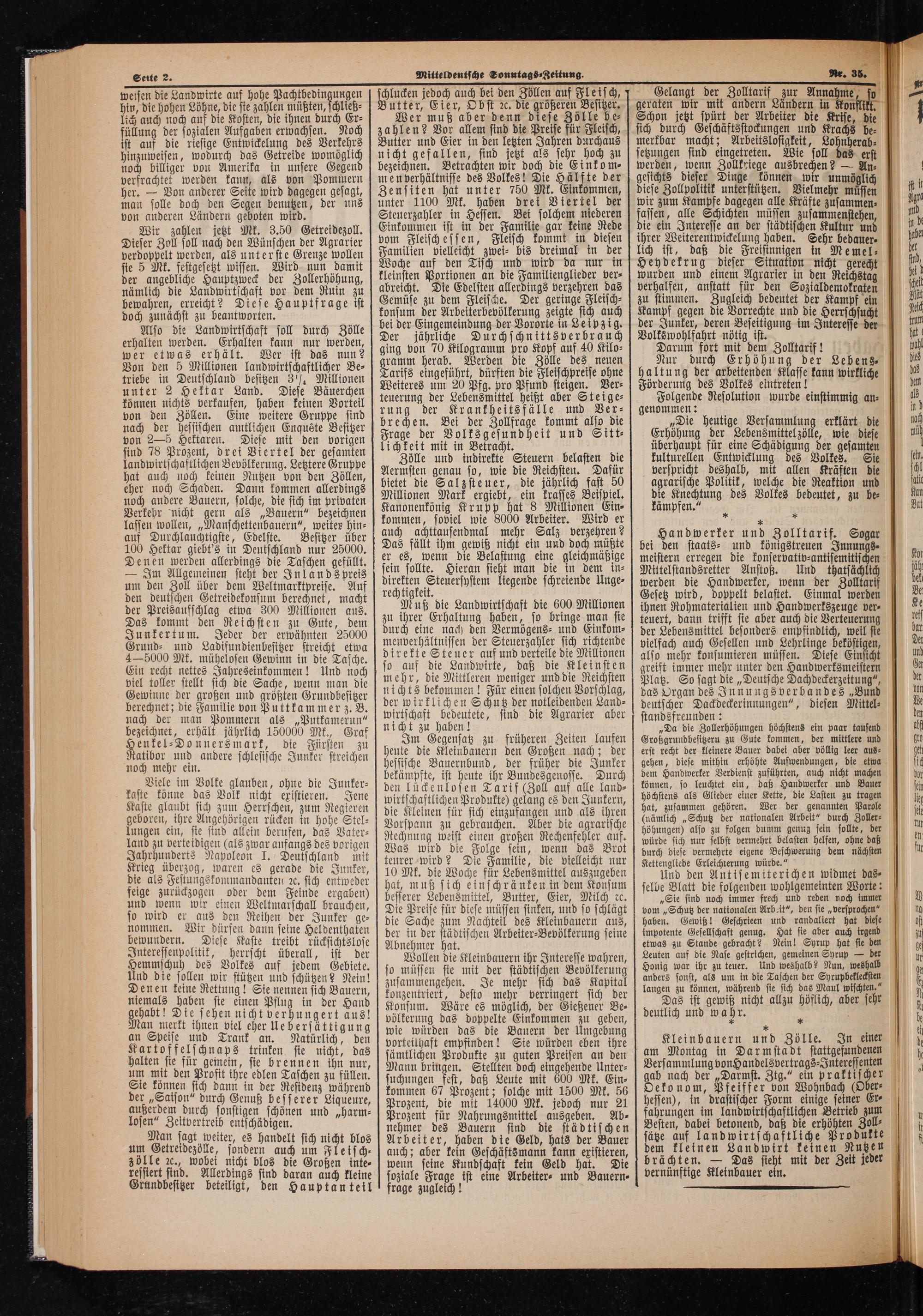 Wir zahlen jetzt Mk. 3.50 Getreidezoll. Dieser Zoll soll nach den Wünschen der Agrarier verdoppelt werden, als unterste Grenze wollen sie 5 Mk. festgesetzt wissen. Wird nun damit der angebliche Hauptzweck der Zollerhöhung, nämlich die Landwirtschaft vor dem Ruin zu bewahren, erreicht? Diese Hauptfrage ist doch zunächst zu beantworten.