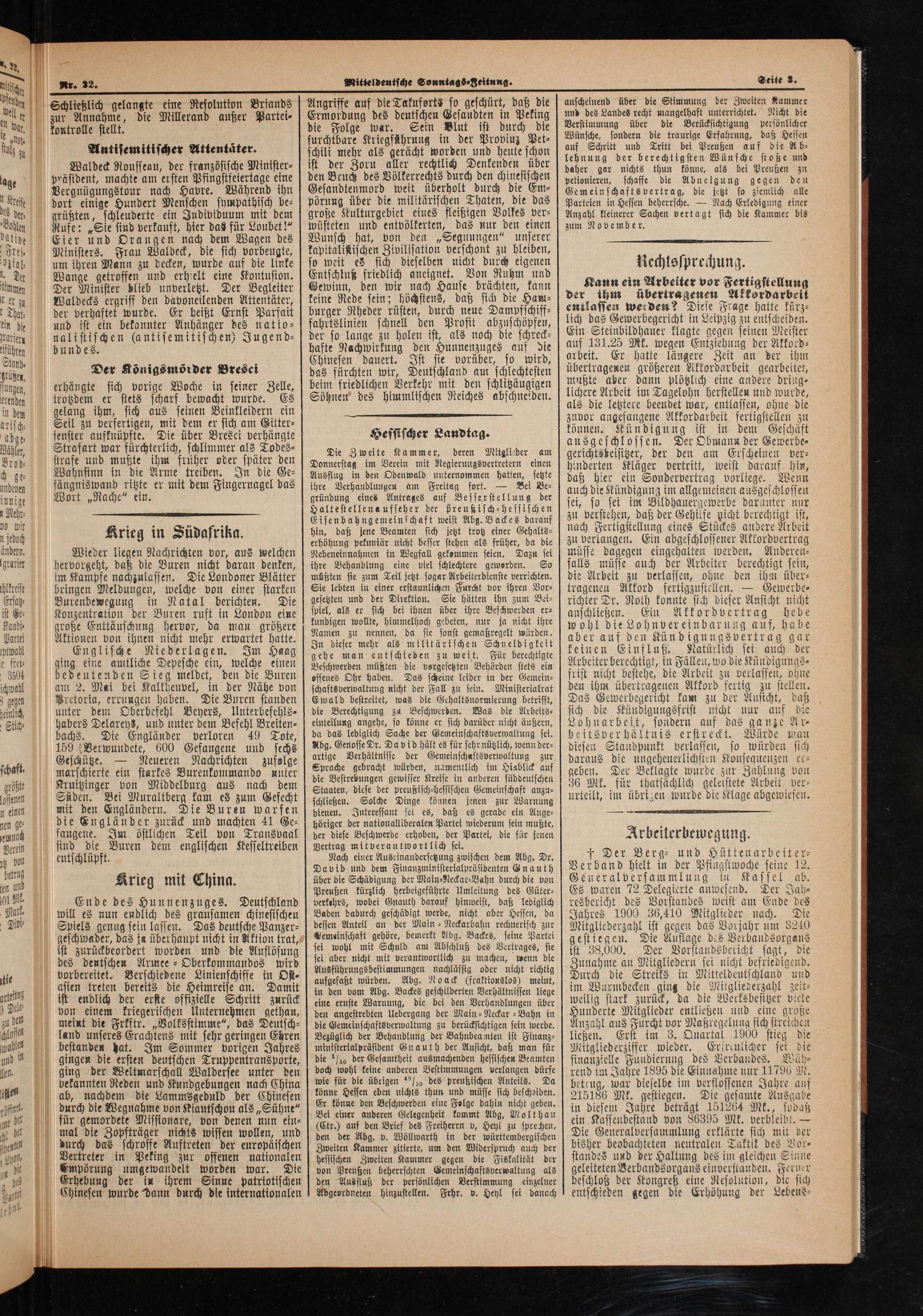 Waldeck Rousseau, der französische Minister⸗ präsident, machte am ersten Pfingstfeiertage eine Vergnügungstour nach Havre. Während ihn dort einige Hundert Menschen sympathisch be⸗ grüßten, schleuderte ein Individuum mit dem Rufe:„Sie sind verkauft, hier das für Loubet!“ Eier und Orangen nach dem Wagen des Ministers. Frau Walbeck, die sich vorbeugte, um ihren Mann zu decken, wurde auf die linke Wange getroffen und erhielt eine Kontusion. Der Minister blieb unverletzt. Der Begleiter Waldecks ergriff den davoneilenden Attentäter, der verhaftet wurde. Er heißt Ernst Parfait und ist ein bekannter Anhänger des natio⸗ 1 0 8 8(antisemitischen) Jugend— bundes.