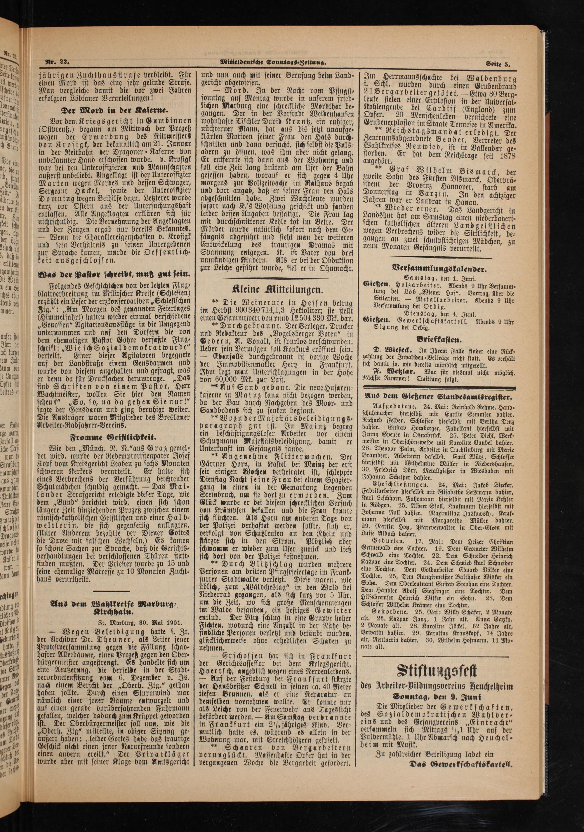 Eheschließungen. 24, Mal: Jakob Stecker, Fabrikarbeiter hierselbst mit Elisabethe Leismann dahier, Karl Leschhorn, Fuhrmann hilerselbst mit Marie Keßler in Rödgen. 25. Albert Stoll, Kaufmann hierselbst mit Johanna Noll dahier. Maximilian Jaskowsky, Kauf⸗ mann hierselbst mit Margarethe Müller dah ier. 29. Martin Hotz, Pfarrverwalter in Ober⸗Gleon mit Luise Albach dahier.