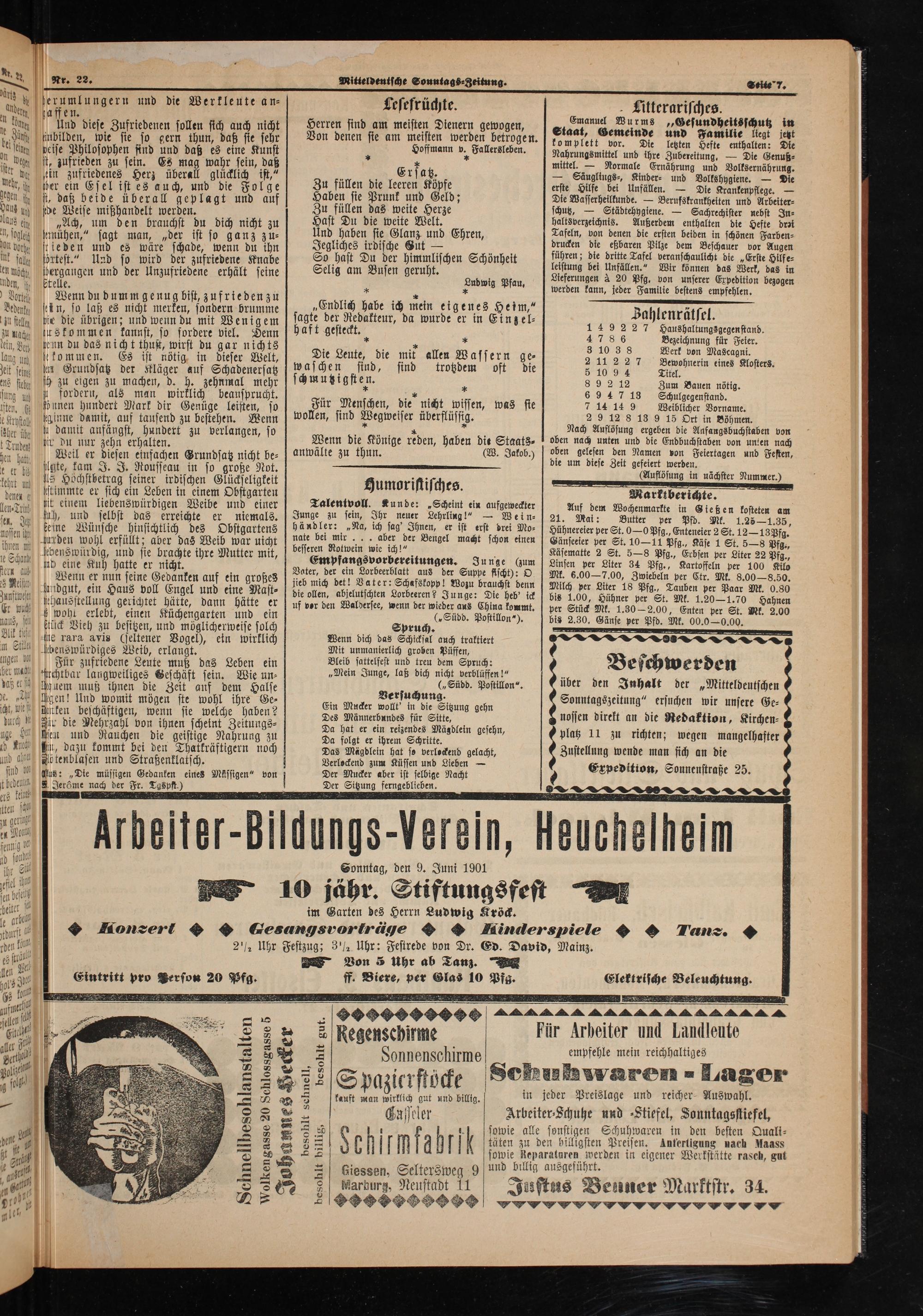 Marktberichte. Auf dem Wochenmarkte in Gießen kosteten am 21. Mai: Butter per Pfd. Mk. 1.25— 1.35,