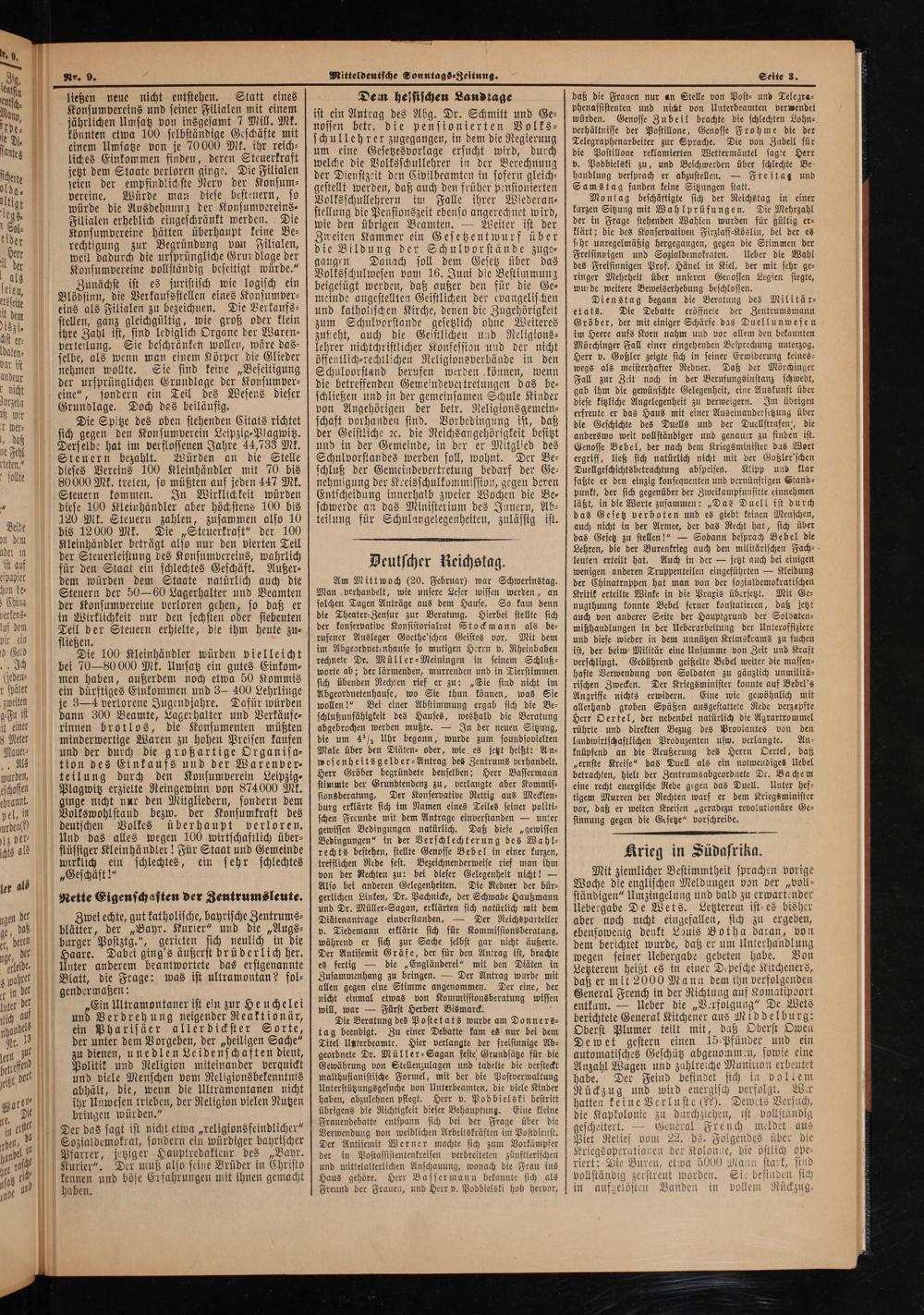 Dienstag begann die Beratung des Militär⸗ etats. Die Debatte eröffnete der Zentrumsmaun Gröber, der mit einiger Schärfe das Duellunwesen im Heere aufs Korn nahm und vor allem den bekannten Mörchinger Fall einer eingehenden Besprechung unterzog. Herr v. Goßler zeigte sich in seiner Erwiderung keines⸗ wegs als meisterhafter Redner. Daß der Mörchinger Fall zur Zeit noch in der Berufungsinstanz schwebt, gab ihm die gewünschte Gelegenheit, eine Auskunft über diese kitzliche Angelegenheit zu verweigern. Im übrigen erfreute er das Haus mit einer Auseinandersetzung über die Geschichte des Duells und der Duellstrafen., die anderswo weit vollständiger und genauer zu finden ist. Genosse Bebel, der nach dem Kriegsminister das Wort ergriff, ließ sich natürlich nicht mit der Goßler'schen Duellgeschichtsbetrachtung abspeisen. Klipp und klar faßte er den einzig konsequenten und vernünftigen Stand⸗ punkt, der sich gegenüber der Zweikampfunsitte einnehmen läßt, in die Worte zusammen:„Das Duell ist durch das Gesetz verboten und es giebt keinen Menschen, auch nicht in der Armee, der das Recht hat, sich über das Gesetz zu stellen!“— Sodann besprach Bebel die