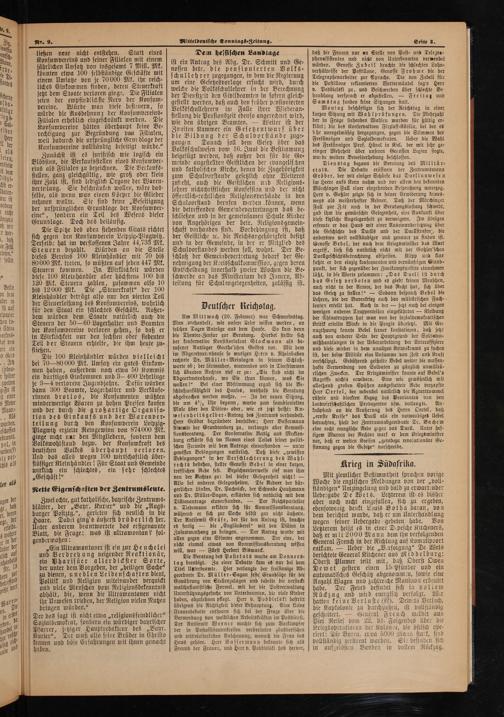 leuten erteilt hat. Auch in der— jetzt auch bei einigen wenigen anderen Truppenteilen eingeführten— Kleidung der Chinatruppen hat man von der sozialdemokratischen Kritik erteilte Winke in die Praxis übersetzt. Mit Ge⸗ nugthuung konnte Bebel ferner konstatieren, daß jetzt auch von anderer Seite der Hauptgrund der Soldaten⸗ mißhandlungen in der Ueberarbeitung der Unteroffiziere und diese wieder in dem unnützen Krimskrams zu suchen ist, der beim Militär eine Unsumme von Zeit und Kraft verschlingt. Gebührend geißelte Bebel weiter die massen⸗ hafte Verwendung von Soldaten zu gänzlich unmilitä⸗ rischen Zwecken. Der Kriegsminister konnte auf Bebel's Angriffe nichts erwidern. Eine wie gewöhnlich mit allerhand groben Späßen ausgestattete Rede verzapfte Herr Oertel, der nebenbei natürlich die Agrartrommel rührte und direkten Bezug des Proviantes von den landwirtschaftlichen Produzenten usw. verlangte. An⸗ knüpfend an die Aeußerung des Herrn Oertel, daß „ernste Kreise“ das Duell als ein notwendiges Uebel betrachten, hielt der Zentrumsabgeordnete Dr. Ba che m eine recht energische Rede gegen das Duell. Unter hef⸗ tigem Murren der Rechten warf er dem Kriegsminister vor, daß er weiten Kreisen„geradezu revolutionäre Ge⸗ sinnung gegen die Gesetze“ vorschreibe. 3