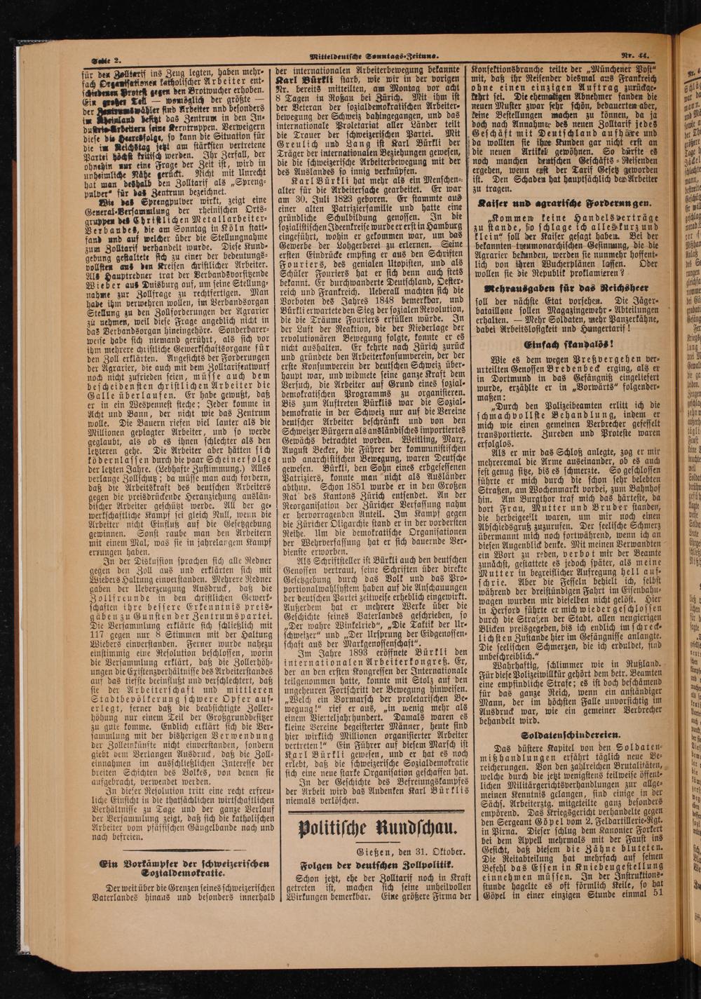 der internationalen Arbeiterbewegung bekannte Karl Bürkli starb, wie wir in der vorigen Nr. bereits mitteilten, am Montag vor acht 8 Tagen in Roßau bei Zürich. Mit ihm ist der Veteran der sozialdemokratischen Arbeiter- bewegung der Schweiz dahingegangen, und das internationale Proletariat aller Länder teilt die Trauer der schweizerischen Partei. Mit Greulich und Lang ist Karl Bürkli der Träger der internationalen Beziehungen gewesen, die die schweizerische Arbeiterbewegung mit der des Auslandes so innig verknüpfen.