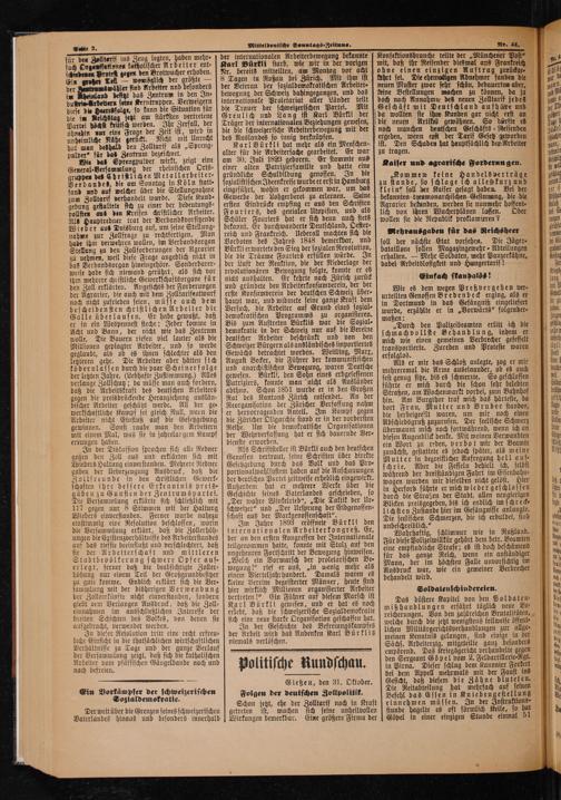 Karl Bürkli hat mehr als ein Menschen⸗ alter für die Arbeitersache gearbeitet. Er war am 30. Juli 1823 geboren. Er stammte aus einer alten Patrizierfamilie und hatte eine gründliche Schulbildung genossen. In die sozialistischen Ideenkreise wurde er erst in Hamburg eingeführt, wohin er gekommen war, um das Gewerbe der Lohgerberei zu erlernen. Seine ersten Eindrücke empfing er aus den Schriften Fouriers, des genialen Utopisten, und als Schüler Fouriers hat er sich denn auch stets bekannt. Er durchwanderte Deutschland, Oester⸗ reich und Frankreich. Ueberall machten sich die Vorboten des Jahres 1848 bemerkbar, und Bürkli erwartete den Sieg der sozialen Revolution, die die Träume Fouriers erfüllen würde. In der Luft der Reaktion, die der Niederlage der revolutionären Bewegung folgte, konnte er es nicht aushalten. Er kehrte nach Zürich zurück und gründete den Arbeiterkonsumverein, der der erste Konsumverein der deutschen Schweiz über⸗ haupt war, und widmete seine ganze Kraft dem Versuch, die Arbeiter auf Grund eines sozial⸗ demokratischen Programms zu organisieren. Bis zum Auftreten Bürklis war die Sozial⸗ demokratie in der Schweiz nur auf die Vereine deutscher Arbeiter beschränkt und von den Schweizer Bürgern als ansländisches importtertes Gewächs betrachtet worden. Weitling, Marx, August Becker, die Führer der kommunistischen und anarchistischen Bewegung, waren Deutsche gewesen. Bürkli, den Sohn eines erbgesessenen Patriziers, konnte man nicht als Ausländer abthun. Schon 1851 wurde er in den Großen Rat des Kantons Zürich entsendet. An der Reorganisation der Züricher Verfassung nahm er hervorragenden Anteil. Im Kampf gegen die Züricher Oligarchie stand er in der vordersten Reihe. Um die demokratische Organisationen der Wehrverfassung hat er sich dauernde Ver⸗ dienste erworben.