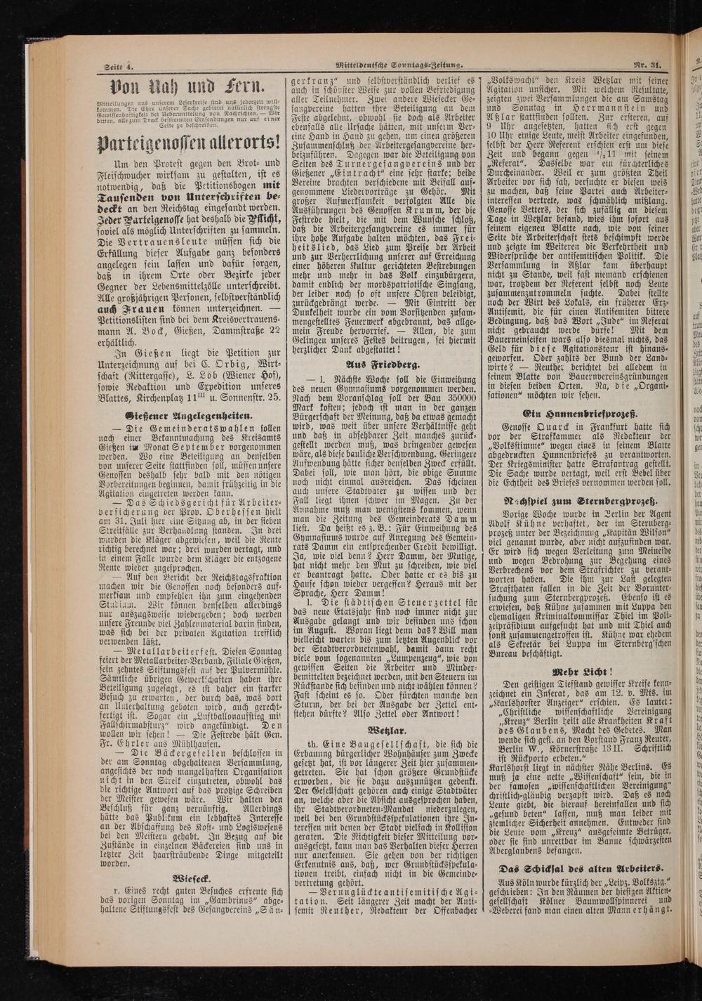 Genosse Quarck in Frankfurt hatte sich vor der Strafkammer als Redakteur der „Volksstimme“ wegen eines in seinem Blatte abgedruckten Hunnenbriefes zu verantworten. Der Kriegsminister hatte Strafantrag gestellt. Die Sache wurde vertagt, weil erst Bebel über die Echtheit des Briefes vernommen werden soll.