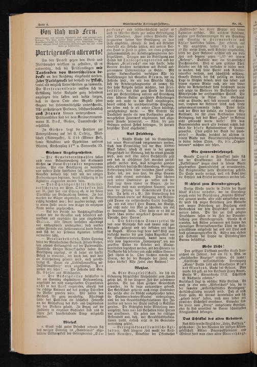 1. Die städtischen Steuerzettel für das neue Etatsjahr sind noch immer nicht zur Ausgabe gelangt und wir befinden uns schon im August. Woran liegt denn das? Will man vielleicht warten bis zum letzten Augenblick vor der Stadtverordnetenwahl, damit dann recht viele vom sogenannten„Lumpenzeug“, wie von gewissen Seiten die Arbeiter und Minder⸗ bemittelten bezeichnet werden, mit den Steuern im Rückstande sich befinden und nicht wählen können? Fast scheint es so. Oder fürchten manche den Sturm, der bei der Ausgabe der Zettel ent⸗ stehen dürfte? Also Zettel oder Antwort!