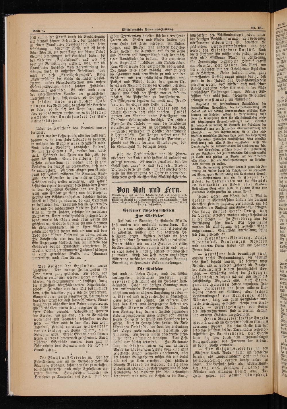 Die Maifeier hat auch in diesem Jahre, nach den bisher vorliegenden Nachrichten wie derum unter größerer Beteiligung als im Vorjahre statt⸗ gefunden. Schon am vorigen Sonntage wur⸗ den entsprechende Versammlungen— um zu⸗ nächst von unserer näheren Umgebung zu reden— in Wieseck und in Heuchelheim abgehalten. Beide waren gut besucht. In ersterem Orte fand das klare und überzeugende Referat des Genossen Krumm allgemeinen Beifall. Nach dem Vortrag trug der erst kürzlich gegründete Arbeitergesangverein einige Lieder vor; abends wurde die Feier bei Musik und Vorträgen fort⸗ gesetzt. Auch in Heuchelheim fanden die Aus⸗ führungen Orbig's, der dort die Bedeutung des Tages auseinandersetzte, lebhafteste Zu⸗ stimmung. Die weiter unten abgedruckte Reso⸗ lution fand einstimmige Annahme. Das Fest⸗ Lokal war hübsch dekoriert.— Zur Versamm⸗ lung in Gießen hatten sich am Mittwoch Abend im Orbig'schen Lokale zwar eine ganz respektable Anzahl Genossen eingefunden, aber bet solchen Gelegenheiten müßte sich das Lokal als viel zu klein erweisen. Hier schilderte Genosse Vetters die Schäden, die die lange Arbeitszeit, übermäßige Anstrengung und schlechte Ernährung der Arbeiter für die Gesamtheit hervorruft und wies an Beispielen die Durch⸗