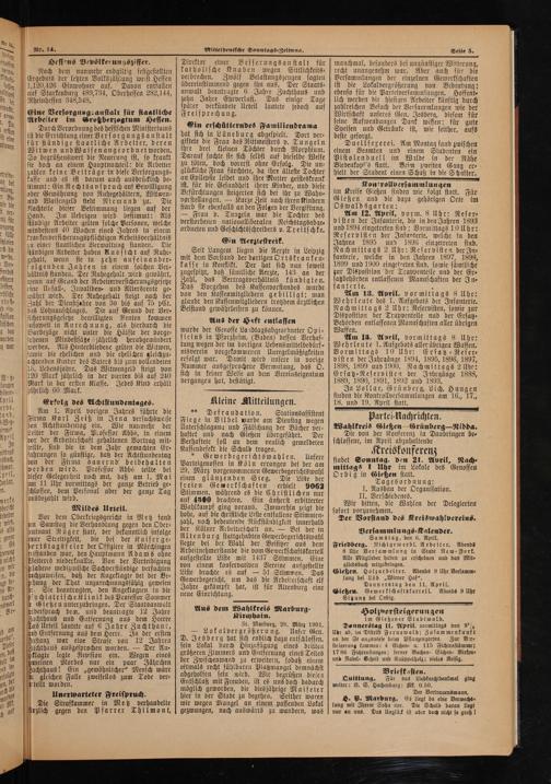 St. Marburg, 28. März 1901. — Lokalvergrößerung. Unser Gen. D. Jesberg hat sich endlich dazu entschlossen, sein Lokal durch Hinzufügung eines dritten größeren Zimmers und Eutfernung eines Teiles der Zwischenwand zu erweitern, sodaß einem oftmals recht fühlbaren Platzmangel demnächst abgeholfen sein wird. Wir begrüßen diesen Entschluß mit Freuden, ist es uns doch dadurch möglich geworden, die diesjährige Maifeier hier in der Stadt zu begehen. Seither waren wir wegen Mangel an einem passenden Lokal gezwungen, nach auswärts zu wandern, was