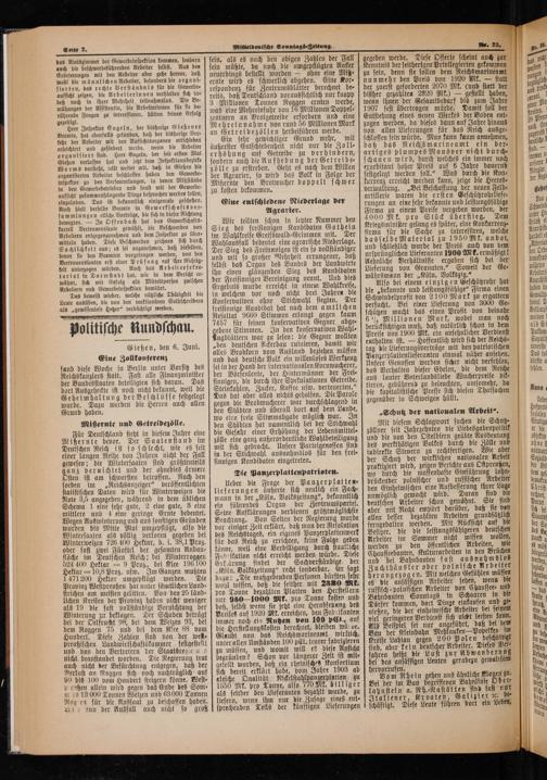 Ueber die Frage der Panzerplatten⸗ lieferungen äußerte sich neulich ein Fach⸗ mann in der„Köln. Volkszeitung“, bekanntlich ein führendes Organ der Zentrumspartei. Seine Aufklärungen verdienen größtmöglichste Beachtung. Von Seiten der Regierung wurde vor einiger Zeit erklärt, daß man der Resolution des Reichstages, ein eigenes Panzerplattenwerk für das Reich zu errichten, keine Folge geben könne, weil eine Verbilligung durch staaliiche Fabrikation nicht erreicht werden würde. Diese Erkeärung findet der Sachverständige der „Köln. Volkszeitung“ recht sonderbar. Er sagt dazu:„Die maßgebenden Personen dürften lehr wohl wissen, daß die Plate mit 2330 Mk. pro Tonne bezahlten Platten den Herstellern nur 9301000 Mk. pro Tonne kosten und daß, selbst wenn sie jetzt eine Herahsetzung des Preises auf 1920 Mk. erreichen, den Fabrikanten immer noch ein Nutzen von 100 pCt., auf die Herstellungskosten berechnet, bleiben wü be. Glaubt nun das Reichsmarineamt wirklich, unter allen Umständen 100 pCt. teurer fabrizieren zu müssen, und womit will es diese Ansicht begründen? Schon vor längerer Zeit ist mit⸗ geteilt worden, daß ein rheinisches Konsortium sich bereit erklärt habe, vom Jahre 1903 ab gleiche Qualität Nickelstahlpanzerplatten zu 1550 Mk. pro Tonne, also 770 Mk. billiger als seither den Lieferanten bezahlt wurde, zu liefern, wenn ihm nur die Zusage eines ent- sprechenden Teils der künftigen Lieferungen