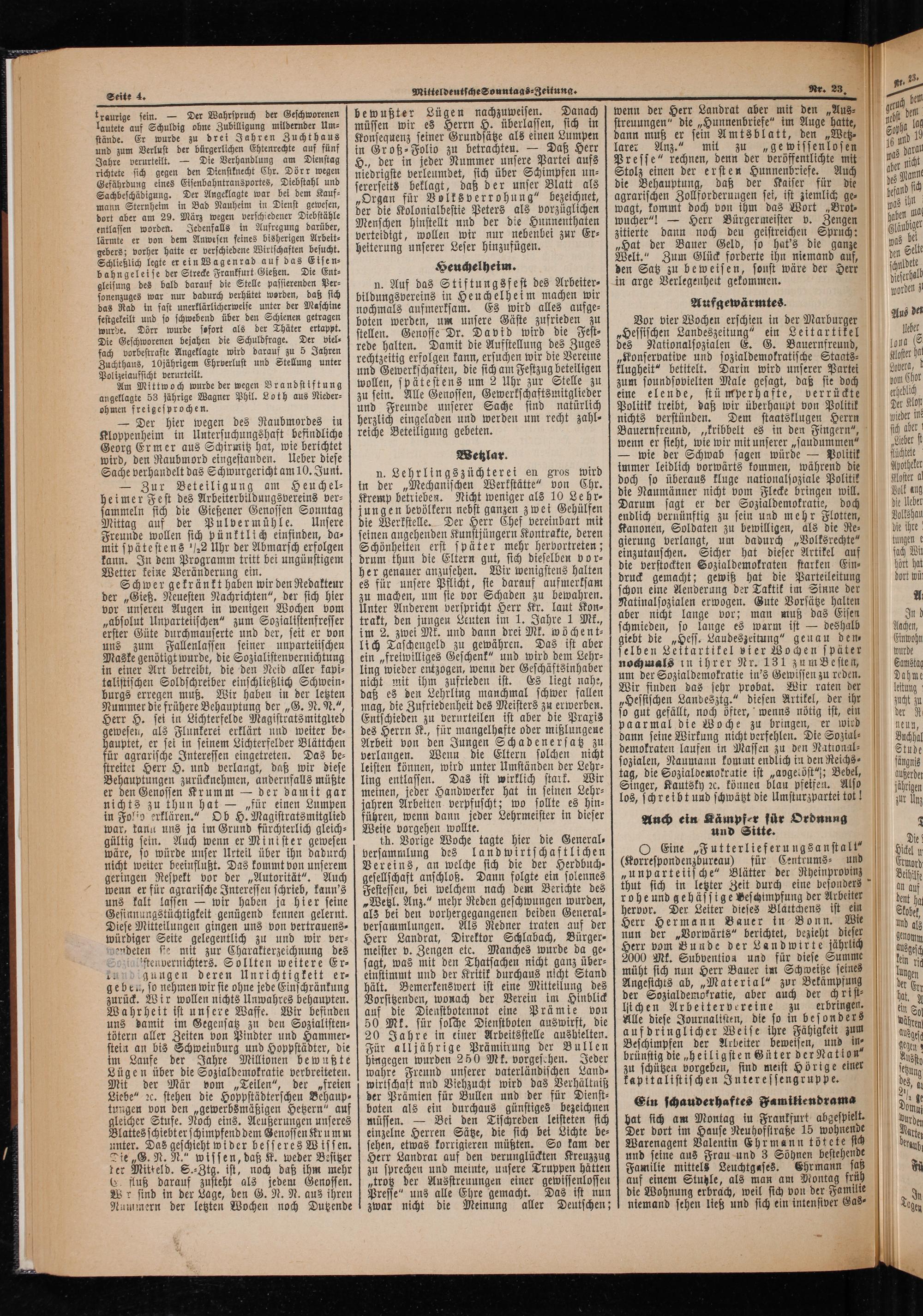 Schwer gekränkt haben wir den Redakteur der„Gieß. Neuesten Nachrichten“, der sich hier vor unseren Augen in wenigen Wochen vom „absolut Unparteiischen“ zum Sozialistenfresser erster Güte durchmauserte und der, seit er von uns zum Fallenlassen seiner unparteiischen Maske genötigt wurde, die Sozialistenvernichtung in einer Art betreibt, die den Neid aller kapi⸗ talistischen Soldschreiber einschließlich Schwein⸗ burgs erregen muß. Wir haben in der letzten Nummer die frühere Behauptung der„G. N. N.“, Herr H. sei in Lichterfelde Magistrats mitglied gewesen, als Flunkerei erklärt und weiter be⸗ hauptet, er sei in seinem Lichterfelder Blättchen für agrarische Interessen eingetreten. Das be⸗ streitet Herr H. und verlangt, daß wir diese Behauptungen zurücknehmen, andernfalls müßte er den Genossen Krumm— der damit gar nichts zu thun hat—„für einen Lumpen in Folio erklären.“ Ob H. Magistratsmitglied war, tann uns ja im Grund fürchterlich gleich⸗ gültig 5 Auch wenn er Minister gewesen wäre, so würde unser Urteil über ihn dadurch nicht weiter beeinflußt. Das kommt von unserem geringen Respekt vor der„Autorität“. Auch wenn er für agrarische Interessen schrieb, kann's uns kalt lassen— wir haben ja hier seine Gesinnungstüchtigkeit genügend kennen gelernt. Diese Mitteilungen gingen uns von vertrauens⸗ würdiger Seite gelegentlich zu und wir ver⸗