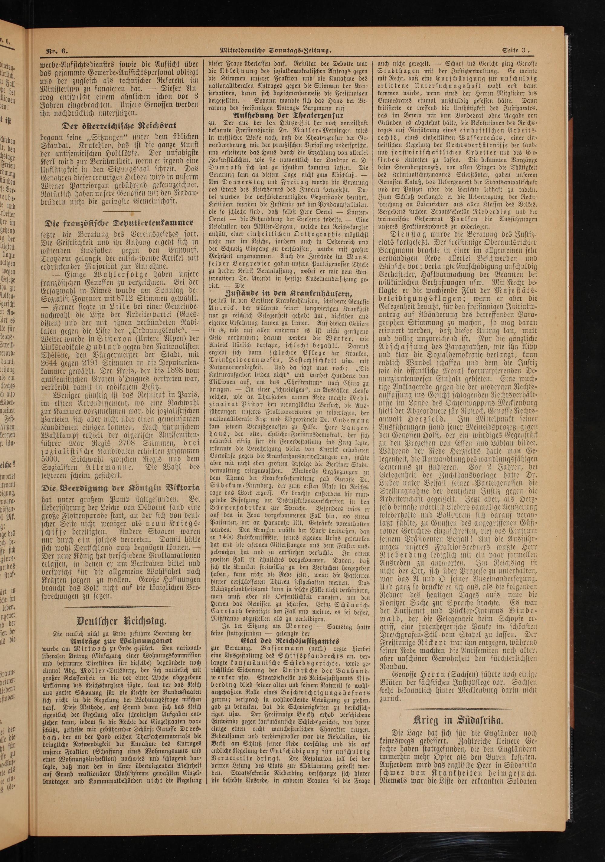 zu. Der aus der lex Heinze⸗Zeit her noch vorteilhaft bekannte Freisinnsjurist Dr. Müller-Meiningen wies in trefflicher Welse nach, daß die Theaterzensur der Ge⸗ werbeordnunt wie der preußischen Verfassung widerspricht, und erheiterte das Haus durch die Erzählung von allerlei Zensurstückchen, wie sie namentlich der Landrat a. D. Dumrath sich hat zu schulden kommen lassen. Die Beratung kam an diesem Tage nicht zum Abschluß.— Am Donnerstag und Freitag wurde die Beratung des Etats des Reichsamts des Innern fortgesetzt. Da— bei wurden die verschiedenartigsten Gegenstände berührt. Kritisiert wurden die Zustände auf den Postdampferlinien, die so schlecht sind, daß selbst Herr Oertel— Knuten⸗ Oertel— die Behandlung der Seeleute tadelte.— Eine Resolution von Müller⸗Sagan, welche den Reichskanzler anhält, einer einheitlichen Orthographie möglichst nicht nur im Reiche, sondern auch in Oesterreich und der Schweiz Eingang zu verschaffen, wurde mit großer Mehrheit angenommen. Auch die Zustände im Mans⸗ felder Bergrevier gaben unsern Parteigenossen Thiele zu herber Kritik Veranlassung, wobei er mit dem Kon⸗ servativen Dr. Arendt in heftige Auseinandersetzung ge⸗ riet.— Die