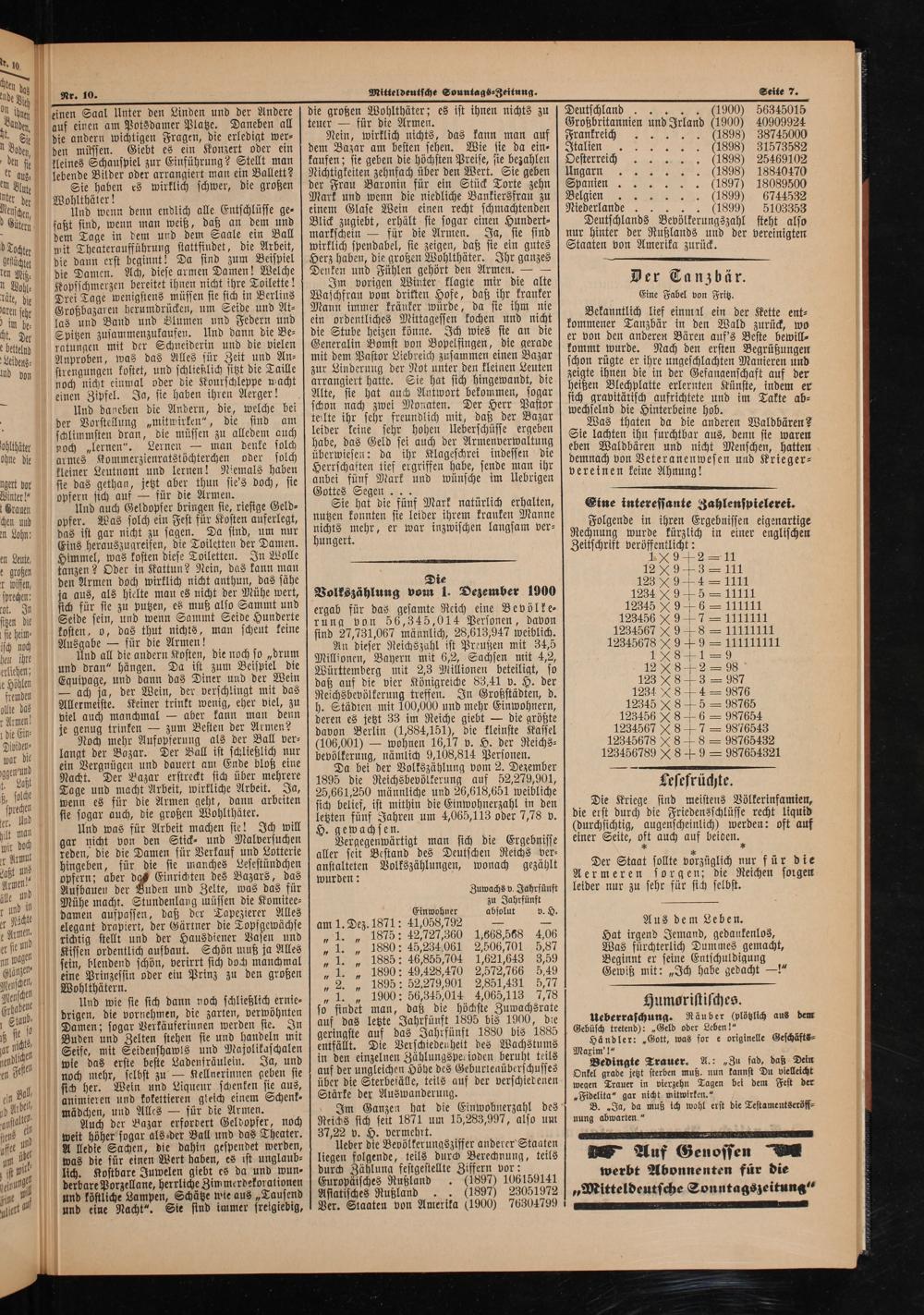 an ende 0 Nr. 10. Mitteldeutsche Sountags⸗Zeitung. Seite 7. 9 ihnen. einen Saal Unter den Linden und der Andere die großen Wohlthäter; es ist ihnen nichts zu Deutschland...(1900) 56345015 aden. auf einen am Potsdamer Platze. Daneben all] teuer— für die Armen. Großbritannien und Irland(1900) 40909924 S die andern wichtigen Fragen, die erledigt wer⸗ Nein, wirklich nichts, das kann man auf Frankreich. 898) 38745000 n Jide, den müssen. Giebt es ein Konzert oder ein] dem Bazar am besten sehen. Wie sie da ein⸗ en ß ben set. kleines Schauspiel zur Einführung? Stellt man kaufen; sie geben die höchsten Preise, sie bezahlen] Oesterreic gh.....(1898) 25469102 er guz, lebende Bilder oder arrangiert man ein Ballett? Nichtigkeiten zehnfach über den Wert. Sie geben Ungann 1898) 18840470 em Blute Sie haben es wirklich schwer, die großen] der Frau Baronin für ein Stück Torte zehn Spanien(1897) 18089500 lter der Wohlthäter! Mark und wenn die niedliche Bankiersfrau zu Belgien(1899) 6744532 Mensen, Und wenn denn endlich alle Entschlüsse ge.] einem Glase Wein einen recht schmachtenden[Niederlande...(1899) 5103353 o Gütern faßt sind, wenn man weiß, daß an dem und Blick zugiebt, erhält sie sogar einen Hundert⸗ Deutschlands Bevölkerungszahl steht also 0 dem Tage in dem und dem Saale ein Ball markschein— für die Armen. Ja, sie sind nur hinter der Rußlands und der vereinigten Tochter mit Theateraufführung stattfindet, die Arbeit,] wirklich spendabel, sie zeigen, daß sie ein gutes[Staaten von Amerika zurück. geflüchtet die dann erst Ach die Da 155 wen! elche Bene und Fülen abb den Ihr ganzes ten Miz⸗ die Damen.„ diese armen Damen! Welche enken und Fühlen gehört den Armen.—— 1 1 al Kopfschmerzen bereitet ihnen nicht ihre Toilette! Im vorigen Winter klagte mir die alte Der Tanzbär. rate, de Drei Tage 8 1 sie sich 10 1 0 Manpfinn 915 e Hoße⸗ a ihr 1 5 Eine Fabel von Fritz. garen Großbazaren herumdrücken, um Seide un= ann immer kränker würde, da sie ihm nie 1 5 in 1 las 155 Band und Blumen und Federn und ein ordentliches Mittagessen kochen und nicht Wine 1100 n en 25 117 e ent⸗ ht. Der Spitzen zusammenzukaufen. Und dann die Be⸗ die Stube heizen könne. Ich wies sie an die er von den Ander Bären a 73 Beste be il ebe katungen mit der Schneiderin und die vielen Generalin Bomst von Bopelfingen, die gerade kommt wurde. Nach den ert Be e bewi Lede. Anproben, was das Alles für Zeit und An⸗ mit dem Pastor Liebreich zusammen einen Vazar schon rügte er te a eichluchten Monte ud on—strengungen kostet, und schließlich sitzt die Taille zur Linderung der Not unter den kleinen Leuten wuigte ihnen die in 15 Get 1 111 01 135 noch nicht einmal oder die Kourschleppe wacht arrangiert hatte. Sie hat sich hingewandt, die heißen Blechplatte erlernt 1 10 17155 1115 er einen Zipfel. Ja, sie haben ihren Aerger! Alte, sie hat auch Autwort bekommen, sogar sich graitärisch aufrichtet 5 5 e, Salle er 1 Und daneben die Andern, die, welche bei schon nach zwei Monaten. Der Herr Pastor pechselnd die Hinterbeine 705 im Takte ab⸗ der Vorstellung„mitwirken“, die sind am teilte ihr sehr freundlich mit, daß der Bazar Was thaten da die anderen doe f schlimmsten dran, die müfsen zu alledem auch leider keine sehr hohen Ueberschüsse ergeben] Sie lachten ihn furchtbar 11 en oller boch„lernen“. Lernen— man denke solch habe, das Geld sei auch der Armenverwaltung eben Waldbären und nicht Wh sie 11 ohne die armes Kommerzienratstöchterchen oder solch überwiesen: da ihr Klageschrei indessen die] demnach von Veteranenwesen 1d i 85 kleiner Leutnant und lernen! Niemals haben Herrschaften tief ergriffen habe, sende man ihr vereinen keine Ahnung! e, 0 bor sie das gethan, jetzt aber thun sie's doch, sie e und wünsche im Uebrigen 9 Winter!“ opfern sich auf— für die Armen. ottes Segen 4 655 t Grauen 2 Und auch Geldopfer bringen 5 riesige 1 0 e le ir e Eine interessante Zahlenspielerei. chen er. Was solch ein Fest für Kosten auferlegt 5 r ihr. 1;. a ll 15 ist 155 1 1 15 Da sud, 1 1 195 ehr, er war inzwischen langsam ver⸗ Hehnung wunde eh in e e ins herauszugreifen, die Toiletten der Damen. gert.. zffentlicht en Leute, 9 5 98 ed diese Toiletten. In Wolle Acht eee 1 k großen tanzen? Oder in Kattun? Nein, das kann man 127. 9 1 3= 111 r bissen, den Armen doch wirklich nicht anthun, das sähe Die 428989 1111 sprechen: ja aus, als hielte man es nicht der Mühe wert, Volkszählung vom 1. Dezember 1900 1234 495 11111 a e ee ae ene 1 8 Sammt an, ergab für das gesamte Reich eine Bevölke. 12345 9 6 111111 e en edun dene rung von 50,345, 16 Personen, davon 12345609 71111111 sehen, boten o, deg thut mice man scheut keine sind 27,781,067 männlich 28618947 weiblich 1234567 98—111111¹ů1 ich h Ausgabe— für die Armen!. An dieser Reichszahl ist Preußen mit 34,5 12345678 899 111111111 hen ihre Und all die andern Kosten, die noch so„drum Millionen Bayern mit 6,2, Sachsen mit 4.2 1 9891 liehen: d dran“ hängen. Da ist zum Beispiel die. g f 99776 i 0 N erliehen; 75 050 ed der Neis Württemberg mit 2,3 Millionen beteiligt, so 12 48 + 2= 98 e Höhlen Equipage, 57. Wei 5 berschlingt wil das daß auf die vier Königreiche 83,41 v. H. der 123 48 + 3= 987 fremden— ach ja, der Wein, 15 e 1 Reichsbevölkerung treffen. In Großstädten, d. 1234 48 +4= 9876 ale un Allermeste, Keiner kin wenig ebe miez in b. Städten mit 100,000 und mehr Einwohnern, 12345 8 5 98765 unn pie auch manchmal age end. Armen? deren es jetzt 33 im Aeiche giebt.— die größte 12345608 6 987654 den. je genug trinken„ um ester der Ball per. davon Berlin(4,884,150, die kleinste Kasel 1234567 08 7 9876543 Duodder Noch mehr Aufopferung aß fert ac un(106,001)— wohnen 10,17 p. H, der Reichs. 12545678 88 98765432 um de langt der Bazar. Der Ball ist schließlich nur, bevölkerung, nämlich 9,108,814 Personen. 123456789„8 9 987654321 ber Na ee ene e 0 0 ere Da bei der Volkszählung vom 2. Dezember 8 5 3 5 Bor Ff 75 b. La 