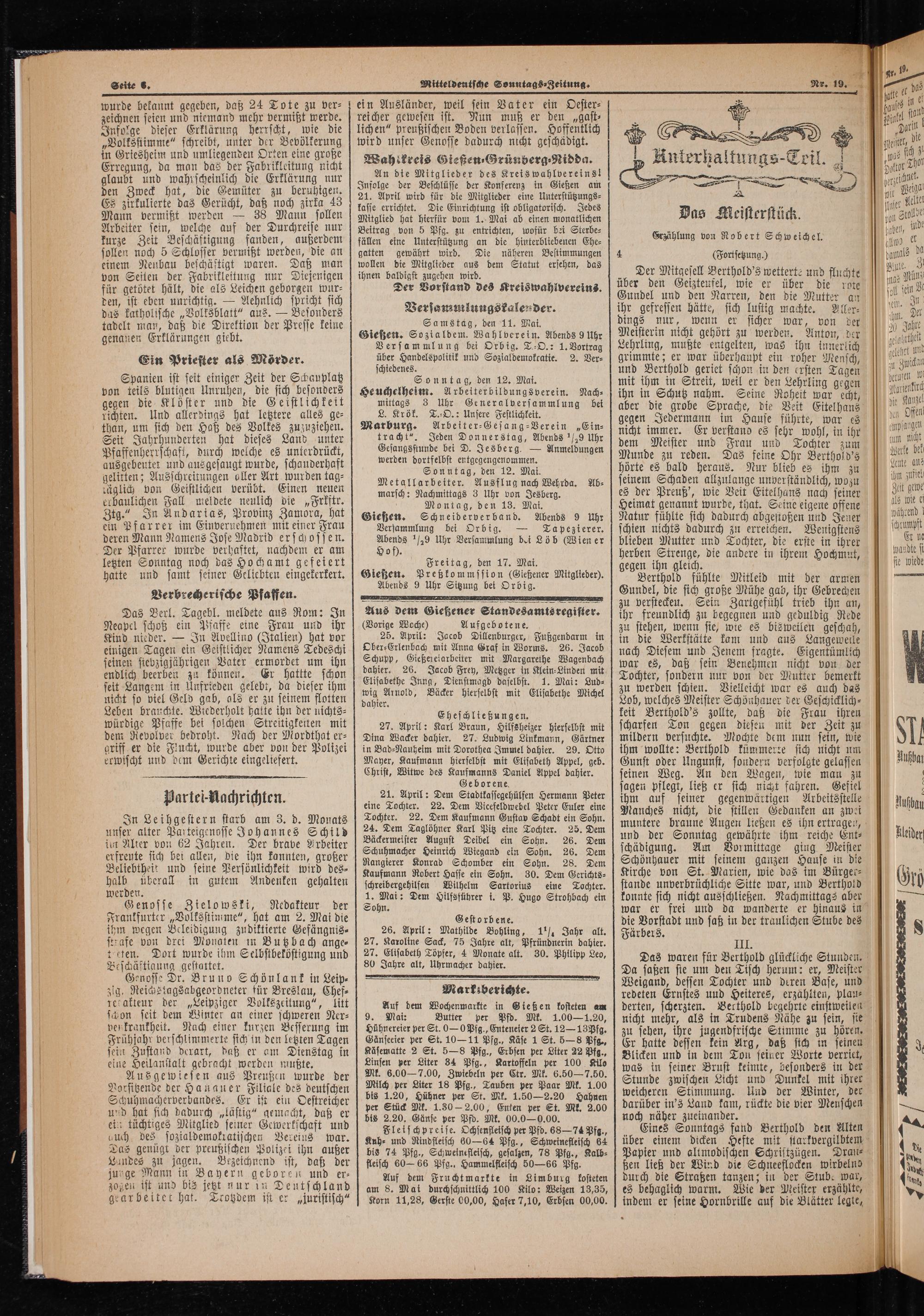 25. April: Jacob Dillenburger, Fußgendarm in Ober⸗Erlenbach mit Anna Graf in Worms. 26. Jacob Schupp, Gießereiarbeiter mit Margarethe Wagenbach dahier. 26. Jacob Frey, Metzger in Klein-Linden mit Elisabethe Inng, Dienstmagd daselbst. 1. Mai: Lud⸗ wig Arnold, Bäcker hierselbst mit Elisabethe Michel dahier.