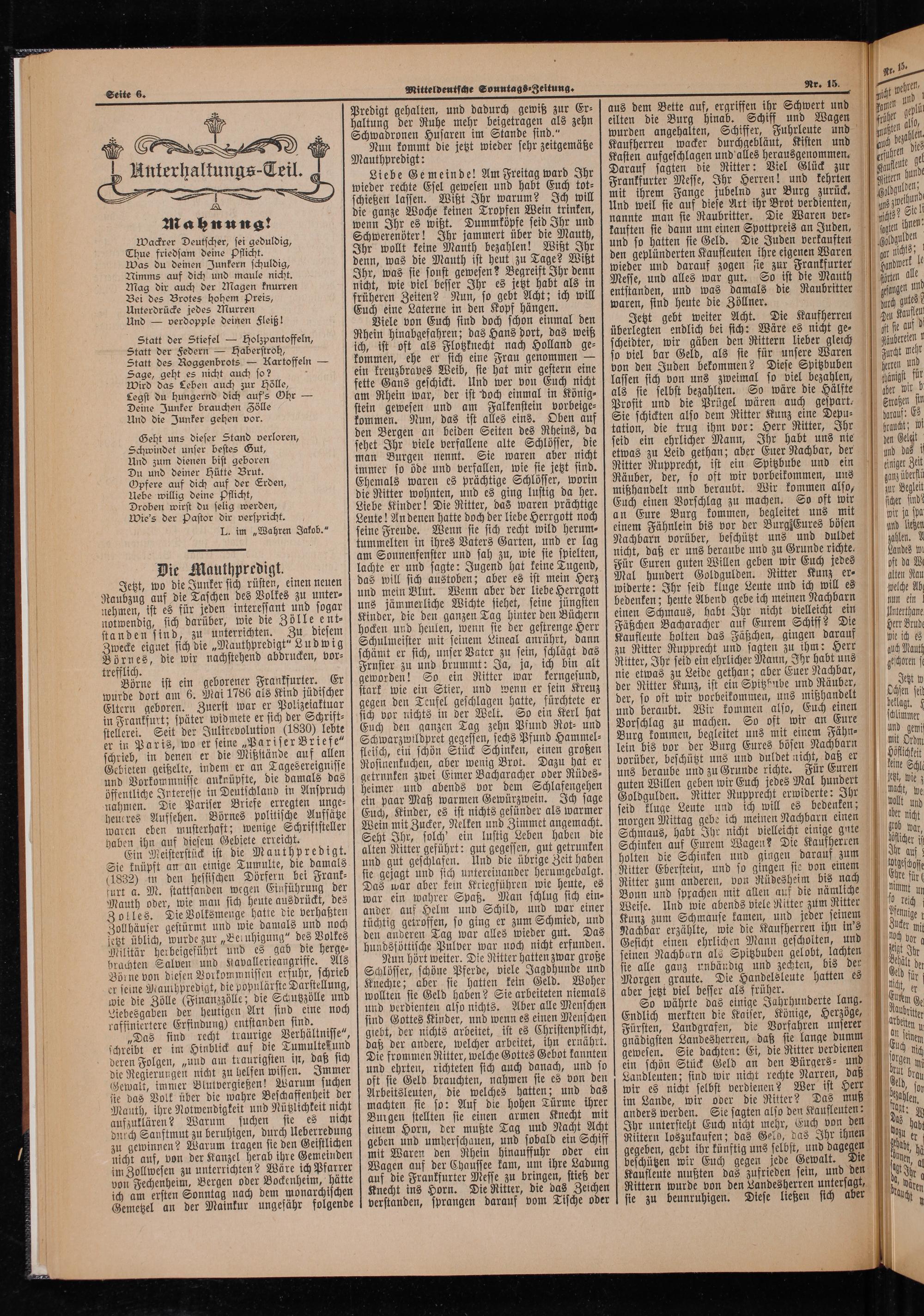 Liebe Gemeinde! Am Freitag ward Ihr wieder rechte Esel gewesen und habt Euch tot⸗ schießen lassen. Wißt Ihr warum? Ich will die ganze Woche keinen Tropfen Wein trinken, wenn Ihr es wißt. Dummköpfe seid Ihr und Schwerenöter! Ihr jammert über die Mauth, Ihr wollt keine Manth bezahlen! Wißt Ihr denn, was die Mauth ist heut zu Tage? Wißt Ihr, was sie sonst gewesen? Begreift Ihr denn nicht, wie viel besser Ihr es jetzt habt als in früheren Zeiten? Nun, so gebt Acht; ich will Euch eine Laterne in den Kopf hängen.