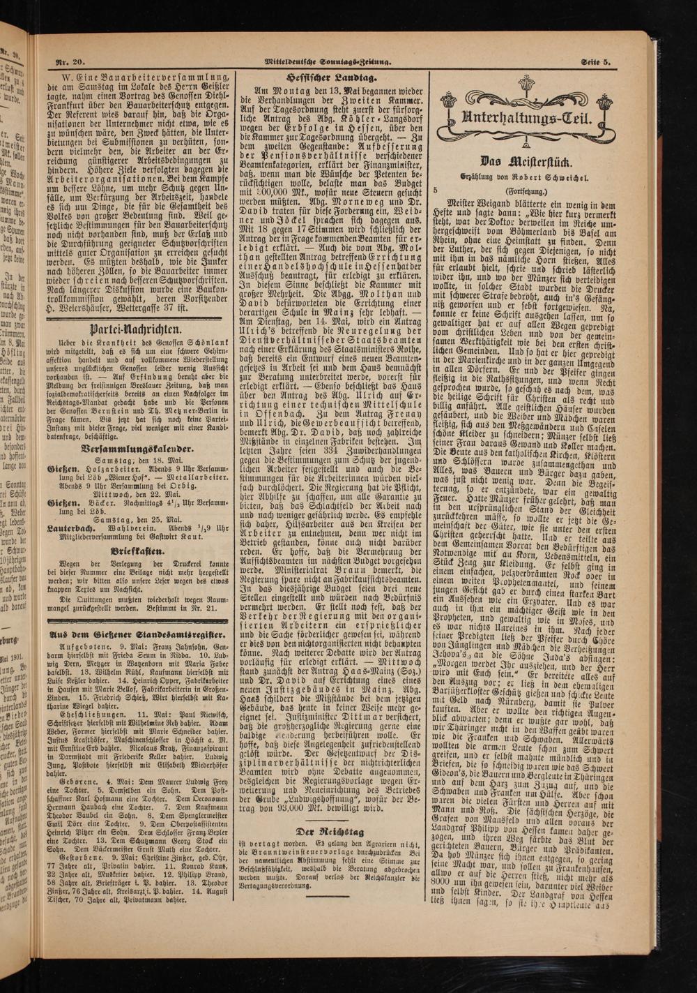 Eheschließ ungen. 11. Mai: Paul Niewisch, Schriftsetzer hierselbst mit Wilhelmine Reh dahier. Adam Weber, Former hierselbst mit Marie Schneider dahier. Justus Krafthöfer, Maschinenschlosser in Höchst a. M. mit Ernstine Erb dahier. Nicolaus Kratz, Finanzaspirant in Darmstadt mit Friederike Keller dahier. Ludwig Jung, Postbote hierselbst mit Elisabeth Wiederhöfer dahier.