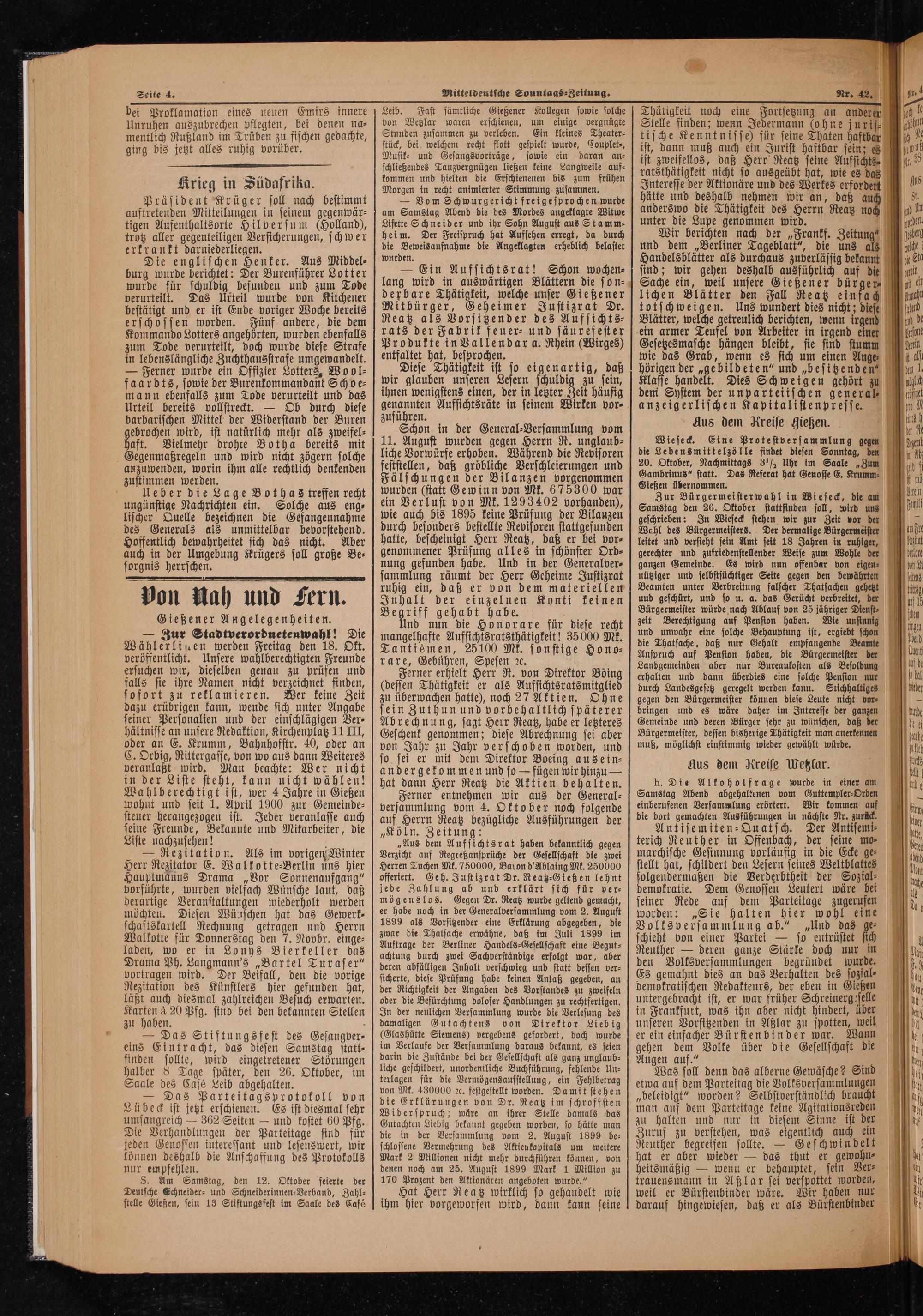 — Ein Aufsichtsrat! Schon wochen⸗ lang wird in auswärtigen Blättern die son⸗ derbare Thätigkeit, welche unser Gießener Mitbürger, Geheimer Justizrat Dr. Reatz als Vorsitzender des Aufsichts⸗ rats der Fabrik feuer- und säurefester Produkte in Vallendar a. Rhein(Wirges) entfaltet hat, besprochen.