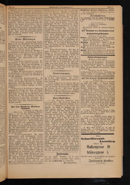 Ans dem Wahlkreise Marburg⸗ Kirchhain. St. Marburg, 18. April 1901. — Maifeier. Zur diesjährigen Maifeier findet— wie aus dem Inserat ersichtlich— am Mittwoch den 1. Mai eine Versammlung der Genossen im Jesbergschen Lokale statt, zu welcher Stadtverordneter Krum m⸗Gießen das Referat übernommen hat.— Am darauffolgenden Sonntag, 5. Mai, von nachmittags 4 Uhr ab, wird dann noch in demselben Lokale, welches bekanntlich eine bedeutende Erweiterung erfahren hat, eine Familienfeier mit Concert und Ge⸗ sangsvorträgen veranstaltet. Hoffentlich werden sich beide Veranstaltungen eines guten Besuchs zu erfreuen haben. 105 — Redaktionswechsel. Die hiesige nationalsoziale„Hess. Landeszeitung“ schreibt: „Der verdiente Leiter der„Hessischen Landes- zeitung“, Chefredakteur Erdmanns⸗ dörffer, welcher dieses Vlatt durch seine um⸗ sichlige, geschickte und in durchaus national⸗ sozialem Geist geführte Leitung weit über das Niveau eines Lokalblattes oder einer kleineren Provinzialzeitung gehoben hat, gedenkt die