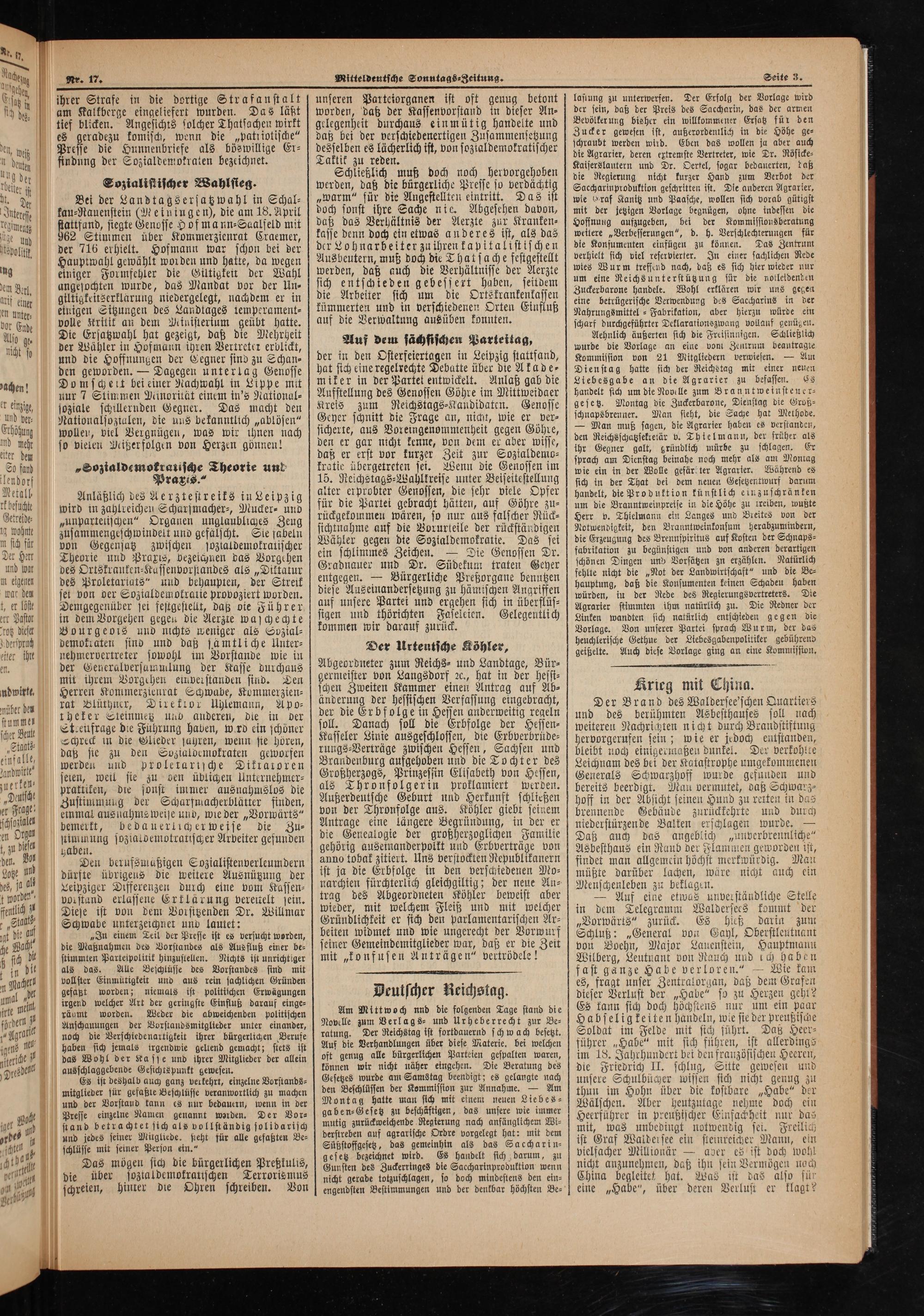 Bei der Landtagsersatzwahl in Schal⸗ kau⸗Rauenstein(Weiningen), die am 18. April stattfand, siegte Genosse Hof mann⸗Saalfeld mit 962 Stimmen über Kommerzienrat Craemer, der 716 erhielt. Hofmann war schon bei der Hauptwahl gewählt worden und hatte, da wegen einiger Formfehler die Giltigkeit der Wahl ungesochten wurde, das Mandat vor der Un⸗ giltigkeitserklarung niedergelegt, nachdem er in einigen Sitzungen des Landtages iemperament⸗ volle Kritit an dem Ministerium geübt hatte. Die Ersatzwahl hat gezeigt, daß die Mehrheit der Wähler in Hofmann ihren Vertreter erblickt, und die Hoffnungen der Gegner sind zu Schan⸗ den geworden.— Dagegen unterlag Genosse Domscheit bei einer Nachwahl in Lippe mit nur 7 Stimmen Minorität einem in's National- soziale schillernden Gegner. Das macht den Nationalsozialen, die uns bekanntlich„ablösen“ wollen, viel Vergnügen, was wir ihnen nach so vielen Mißer folgen von Herzen gönnen!