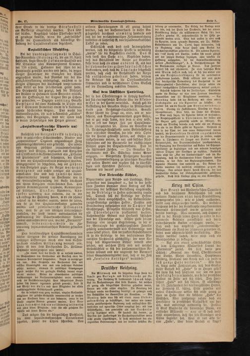 — Auf eine etwas unverständliche Stelle in dem Telegramm Waldersees kommt der „Vorwärts“ zurück. Es hieß darin zum Schluß:„General von Gayl, Oberstleutnant von Boehn, Major Lauenstein, Hauptmann Wilberg, Leutnant von Rauch und uch haben fast ganze Habe verloren.“— Wie kam es, fragt unser Zentralorgan, daß dem Grafen dieser Verlust der„Habe“ so zu Herzen geht? Es kann sich doch höchstens nur um ein paar Habseligkeiten handeln, wie sie der preußische Soldat im Felde mit sich führt. Daß Heer⸗ führer„Habe“ mit sich führen, ist allerdings im 18. Jahrhundert bei den französischen Heeren, die Friedrich II. schlug, Sitte gewesen und unsere Schulbücher wissen sich nicht genug zu thun im Hohn über die kostbare„Habe“ der Wälschen. Aber heutzutage nehme doch ein Heerführer in preußischer Einfachheit nur das mit, was unbedingt notwendig sei. Freilich ist Graf Waldersee ein steinreicher Mann, ein vielfacher Millionär— aver es ist doch wohl nicht anzunehmen, daß ihn sein Vermögen nach China begleitet hat. Was ist das also für eine„Habe“, über deren Verlust er klagt?