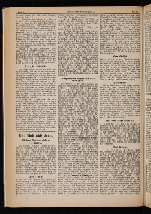 Wir konnten in der letzten Nummer nur ganz kurz auf den Streit, den der Bürgermeister Köhler— selbstverständlich der von Langs⸗ dorf— mit seiner Gemeinde führt, eingehen und das Urteil des Provinzialausschusses mit⸗ teilen. Es dürfte jedoch unsere Leser interessieren, über die netten Verhältnisse in der antisemitisch verwalteten Gemeinde Näheres zu erfahren. Der Kreisausschuß hatte nämlich die Bureau⸗ kosten⸗Entschädigung des Bürgermeisters auf jährlich 752 Mk. erhöht. Bürgermeister Köhler ist nämlich nicht nur Reichs⸗ und Land⸗ tagsabgeordneter, er ist außerdem noch Post⸗ agent, Vorsitzender des Ziegenzuchtvereins, Vorsitzender der Kreiskonferenz der Bürger⸗ meister, Vorsitzender des Zuchtvereins für Simmenthaler Vieh und Vorsitzender der Spar⸗ und Darlehenskasse. Wie die„Frkf. Ztg.“ berichtet, weiß die Gemeinde die Veelseitigkeit nicht recht zu schätzen, denn der Gemeinderat verwahrte sich einmütig gegen die Erhöhung der Vergütung und bezeichnete in seiner Rekurs⸗ schrift die Dtenstführung des Bürger⸗ meisters als leichtfertig, pflichtwidrig und die Gemeinde schädigend; einem tüchtigen Bürgermeister werde die Gemeinde ohne ein Wort des Widerspruchs erhöhte Bureau⸗ kosten vergüten, der Bürgermeister Köhler verdiene sie nicht. In der betreffenden Ver⸗ handlung erschienen für das Kreisamt Gießen Kreisamtmann Böckmann, für die Gemeinde Rechtsanwalt Grünewald. Dieser führte aus, er erkenne die Grundsätze an, nach denen die Behörde die Bureaukosten von dem Gesichts⸗ punkt aus ansetze, daß nicht nur die wirklichen Auslagen zu ersetzen seien, sondern auch eine Vergütung für Arbeitsleistung und Zeitverlust gewährt werde, obwohl das Amt eines Land⸗ bürgermeisters ein Ehrenamt sei. Aber die Frage, ob ein Bürgermeister fleißig, gewissen⸗ haft und tüchtig sei, dem Gemeindewohl förder⸗ lich wirke, müsse geprüft werden. Wenn diese Voraussetzungen nicht zuträfen, so müsse von Erhöhung einer Vergütung abgesehen werden. Die Thätigkeit des Herrn Köhler in der Presse, seine Beleidigungsprozesse, die Arbeit, die er sich mit konfusen Anträgen in der Kammer mache, nehmen ihn derartig in An⸗ spruch, daß er für die Gemeinde nichts thun könne, und deshalb wolle ihn die Gemeinde nicht noch länger als Bürgermeister. Der Vertreter des Kreisamtes erwiderte, er wolle Köhlers Lob nicht reden; er verkenne nicht, daß Köhler eine eigenartige Erscheinung und schwer zu behandeln sei, und daß eine tiefe Kluft zwischen ihm und der Gemeinde