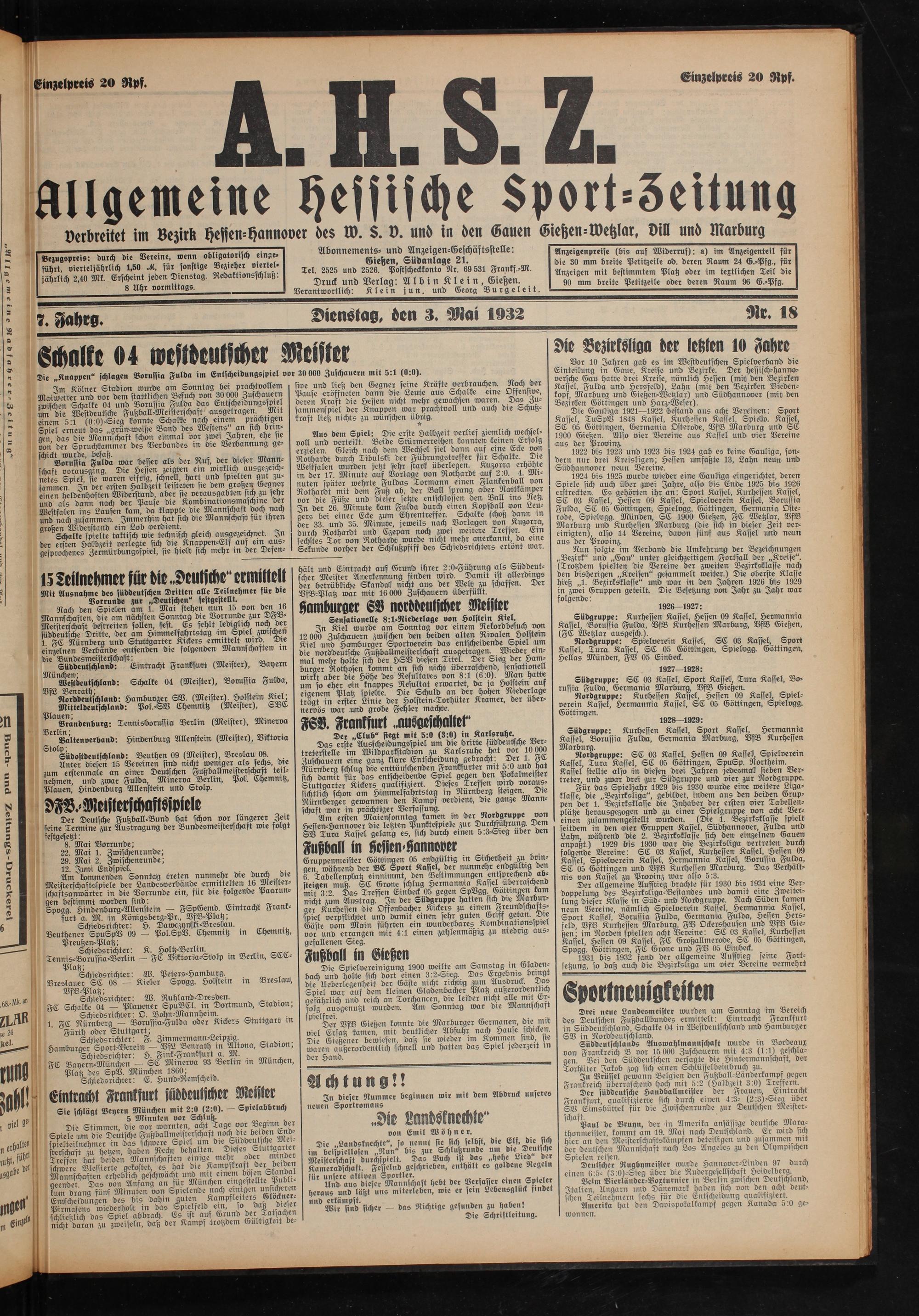 Drei neue Landesmeister wurden am Sonntag im Bereich des Deutschen Fußballbundes ermittelt: Eintracht Frankfurt in Süddeutschland, Schalke 04 in Westdeutschland und Hamburger SW ein Norddeutschland.