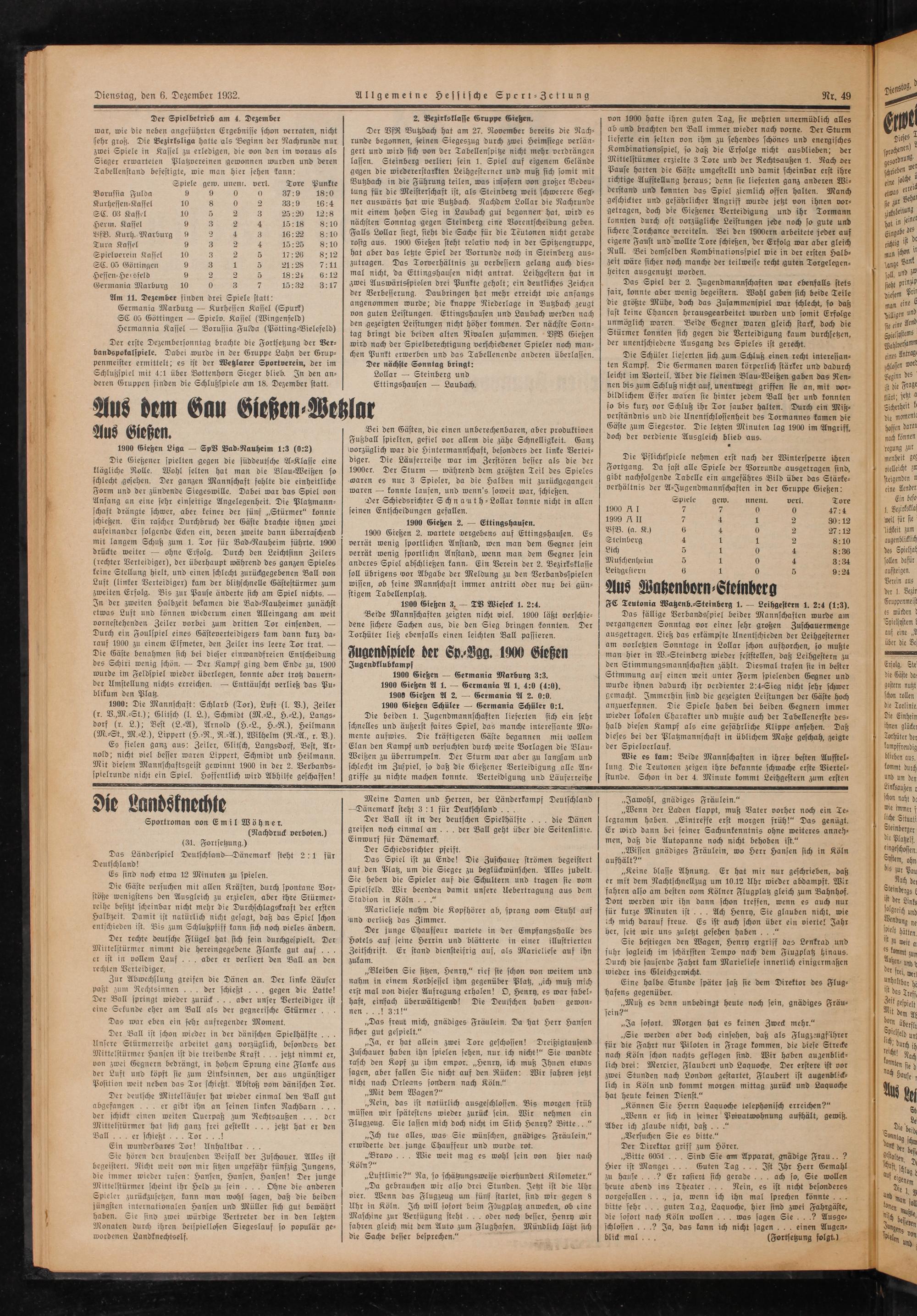 Der Spielbetrieb am 4. Dezember war, wie die neben angeführten Ergebnisse schon verraten, nicht sehr groß. Die Bezirksliga hatte als Beginn der Nachrunde nur zwei Spiele in Kassel zu erledigen, die von den im woraus als Sieger erwarteten Platzvereinen gewonnen wurden und deren Tabellenstand befestigte, wie man hier sehen kann: