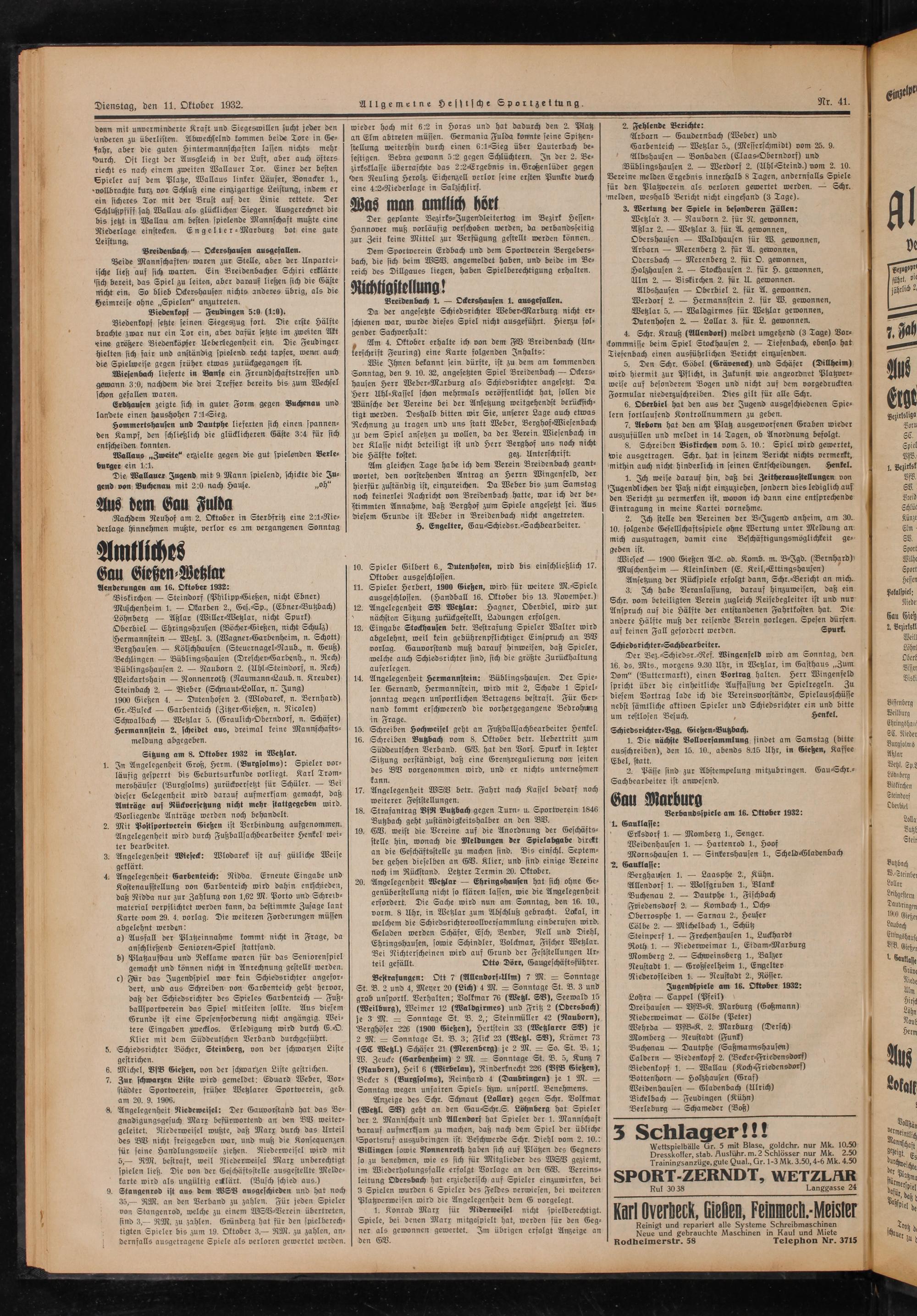Aenderungen am 16. Oktober 1932: Biskirchen— Steindorf(Philipp⸗Gießen, nicht Ebner) Muschenheim 1.— Okarben 2., Ges.⸗Sp.,(Ebner⸗Butzbach) Löhnberg— Aßlar(Willer⸗Wetzlar, nicht Spurk) Oberbiel— Ehringshausen(Böcher⸗Gießen, nicht Schulz) Hermannstein— Wetzl. 3.(Wagner⸗Garbenheim, n. Schott) Berghausen— Kölschhausen(Steuernagel⸗Naub., n. Geuß) Bechlingen— Büblingshausen(Drescher⸗Harbenh., n. Rech) Büblingshausen 2.— Nauborn 2.(Uhl⸗Steindorf, n. Rech) Weickartshain— Nonnenroth(Naumann⸗Laub. n. Kreuder) Steinbach 2.— Bieber(Schnaut⸗Lollar, n. Jung) 1900 Gießen 4.— Dutenhofen 2.(Wlodarek, n. Bernhard) Gr.⸗Buseck— Garbenteich(Zitzer⸗-Gießen, n. Nicoley) Schwalbach— Wetzlar 5.(Graulich-Oberndorf, n. Schäfer) Hermannstein 2. scheidet aus, dreimal keine Mannschafts⸗