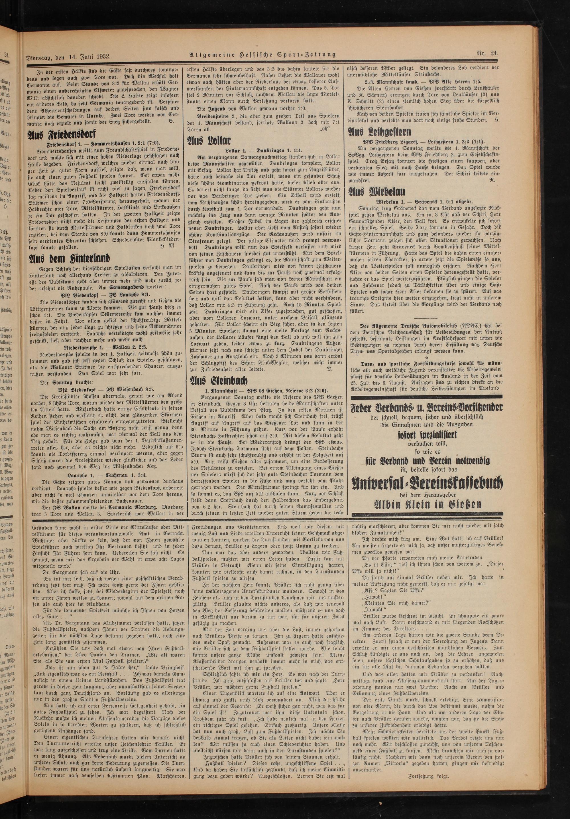 Vergangenen Sonntag weilte die Reserve des VfB Gießen in Steinbach. Gegen 3 Uhr betraten beide Mannschaften unter Beifall des Publikums den Platz. In den ersten Minuten ist Gießen im Angriff. Aber bald macht sich Steinbach frei, träßk Angriff auf Angriff auf das Gießener Tor und kann in der 30. Minute in Führung gehen. Kurz vor der Pause erhöht Steinbachs Halbrechter schon auf 2:0. Mit diesem Resultat geht es in die Pause. Bei Wiederanstoß drängt der VfB etwas. Jedoch Steinbachs Tormann steht auf dem Posten. Steinbachs Sturm ist auch sehr schußfreudig und erhöht in der Folgezeit auf 5:0. Nun reißt Gießen alles zusammen, um eine Verbesserung des Resultates zu erzielen. Bei einem Alleingang eines Gieße— ner Spielers wirft sich der sehr gute Steinbacher Tormann dem betreffenden Spieler in die Füße und muß verletzt vom Platze getragen werden. Der Mittelstürmer springt für ihn ein. And so kommt es, daß VfB auf 5:2 aufholen kann. Kurz vor Schluß stellt dann Steinbach durch den Halbrechten das Endergebnis von 6:2 her. Steinbach hat durch seinen Kampfeswillen und durch seinen in letzter Zeit wieder guten Sturm gegen die tech—