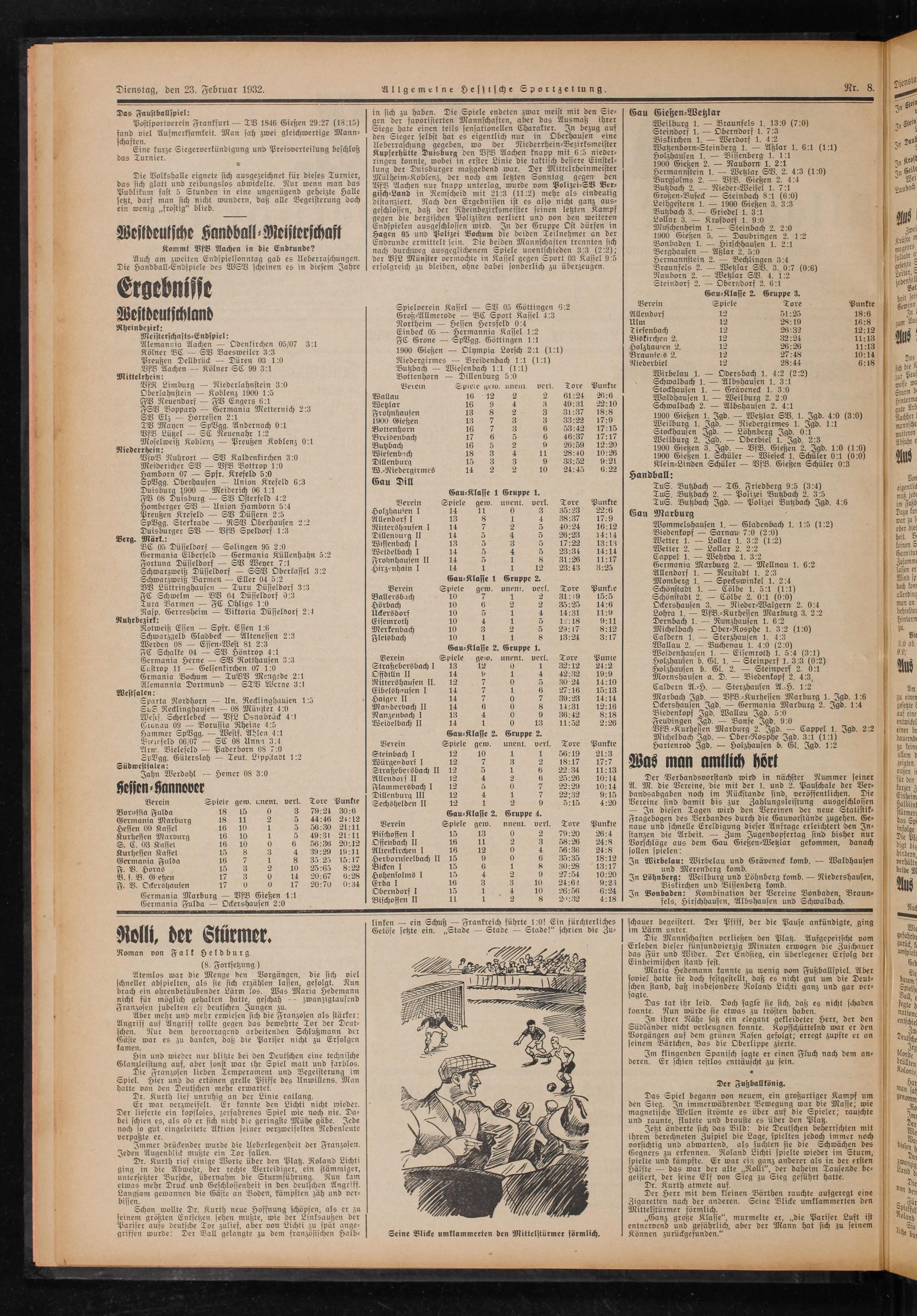 Dienstag, den 23. Februar 1932. Allgemetne Hessische Sportzettung. 8 Das Faustballspiel: in sic zu haben. Eee Mannschef ten, a mit 5 5 Gau Gießen⸗Wetzlar Postsportverein Frankfurt— TW 1846 Gießen 29:27(18:15)[gen der favorisierten Mannschaften, aber das Ausmaß ihrer Weilburg 1.— Braunfels 1. 13:0(7:0) 7 1% Aufmerff 47 1; j 1„ Siege hate einen teils sensationellen Charakter. In bezug auf Ste 2 f. 1 7˙ 5 Aufmerksamkeit. Man sah zwei gleichwertige Mann⸗ den Sieger selbst hat es eigentlich nur in Obe hausen Kine Siekinchen 1 def 15 12 Ei a 155 C; blaß,] Aeberraschung gegeben, wo der Niederrhein⸗Bezirksmeister g 8— Axl. 8 5 5 Eine kurze Siegerverkündigung und Preisverteilung beschloß Kupferhüͤte e den VfB Aachen knapp mit 6•5 nieder⸗ e e eber. 4 6˙1(11) 5 3 ringen konnte, wobei in erster Linie die taktisch bessere Einstel⸗ 1900 Gießen 2.— Nauborn 1 221 N 5 ö 5 8 a 5 5 lung der Duisburger maßgebend war. Der Mittelrheinmeister Aer ein 1 Wetzlar S 2. 4-3(1:0) Die Volkshalle eignete sich ausgezeichnet für dieses Turnier, Mülheim⸗Koblenz, der noch am letzten Sonntag gegen den Wen. 1. BfB. Gießen 9 4 5 das sich glatt und reibungslos abwickelte. Nur wenn man das VfB Aachen nur knapp unterlag, wurde vom Polizei⸗SV Ber⸗ Butzbach 3 Nieder⸗Weisel l 2 Publikum fast 5 Stunden in eine ungenügend geheizte Halle gisch⸗Land in Remscheid mit?(112) mehr als eindeutig Großen⸗Busec Seb 951(670 setzt, darf man sich nicht wundern, daß alle Begeisterung doch] distanziert. Nach den Ergebnissen ist es also nicht ganz aus⸗ Leihgestern 1.— 1900 Gießen 3 3˙3 ein wenig„frostig“ blieb. geschlossen, daß der Rheinbezirksmeister seinen letzten Kampf Buß bach 3. Gpiedel 1. 3111 . gegen die me 1 verliert und von. weiteren Lollar 3.— Krofdorf 1. 970 f Endspielen ausgeschlossen wird. In der Gruppe Ost dürfen in Muschenheim 1.— Steinbach 2. 2: Weosldeulsche Handball⸗Meoisterschaft Hagen 05 und Polizei Bochum die beiden Teilnehmer an der 77 5 4; Gießen 5 ener 9 . 1 2 Endrunde ermittelt sein. Die beiden Mannschaften trennten sich Bonbaden 1.— Hirschhausen 1. 2.1 Kommt Pf Aachen in die Endrunde? nach durchweg ausgeglichenem Spiele unentschieden 3:3(2:2); Berghausen— Aßlar 2. 50 5 Auch am zweiten Endspielsonntag gab es Ueberraschungen.] der Vs Münster vermochte in Kassel gegen Sport 03 Kassel 915 Hermannstein 2.— Bechlingen 34 Die Handball⸗Endspiele des WSW scheinen es in diesem Jahre erfolgreich zu bleiben, ohne dabei sonderlich zu überzeugen. Braunfels 2.— Wetzlar SV. 3. 0.7(0:6) Nauborn 2.— Wetzlar SV. 4. 12 Er ebni U Steindorf 2.— Oberndorf 2. 611 Gau⸗Klasse 2. Gruppe 3. Spielverein Kassel— SV 05 Göttingen 6˙2 Verein Spiele Tore Punkte Wesldeutjchland Groß⸗Allmerode— BC Sport Kassel 413 Allendorf 12 51225 18:6 Rheinbezirk: Northeim— Hessen Hersfeld 0,4 Ulm 12 28.19 16:8 Meisterschafts⸗Endspiel: Einbeck 05— Hermannia Kassel 12 Tiefenbach 12 26•32 12:12 ee irchen 05/7 3 FC Grone— SpVgg. Göttingen 111 Biskirchen 2. 12 32:24 11:13 Alemannia Aachen— Odenkirchen 05/7 311 28 5 8 g Holzhawen 2 12 26.26 11:13 Kölner B— SW Baesweiler 313 1900 Gießen— Olympia Lorsch 2:1(1:1) Braune 12 2748 10˙14 Preußen Dellbrück— Düren 03 1:0 Niedergirmes— Breidenbach 1˙1(171) Niederbiel 2 12 28:44 6·18