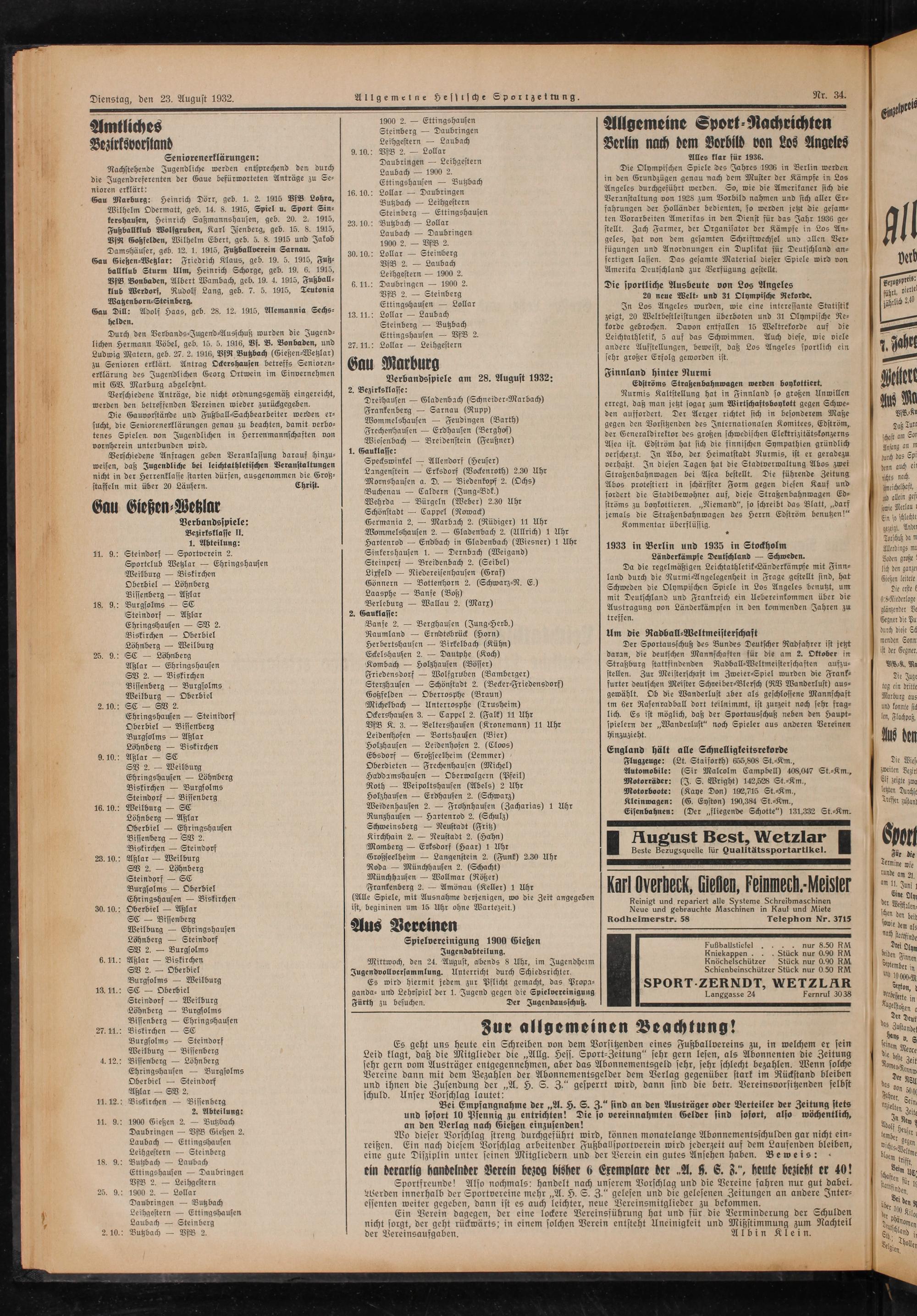 Gau Marburg Verbandsspiele am 28. August 1932: 2. Bezirksklasse: Dreihausen— Gladenbach(Schneider-Marbach) Frankenberg— Sarnau(Rupp) Wommelshausen— Feudingen(Barth) Frechenhausen— Erdhausen(Berghof) Wiesenbach— Breidenstein(Feußner) 1. Gauklasse: Speckswinkel— Allendorf(Heuser) Langenstein— Erksdorf(Vockenroth) 2.30 Uhr Mornshausen a. D.— Biedenkopf 2.(Ochs) Buchenau— Caldern(Jung⸗Bdk.) Wehrda— Bürgeln(Weber) 2.30 Uhr Schönstadt— Cappel(Nowack) Germania 2.— Marbach 2.(Rüdiger) 11 Uhr Wommelshausen 2.— Gladenbach 2.(Ullrich) 1 Uhr Hartenrod— Endbach in Gladenbach(Wiesner) 1 Uhr Sinkershausen 1.— Dernbach(Weigand) Steinperf— Breidenbach 2.(Seibel) Lixfeld— Niedereisenhausen(Graf) Gönnern— Bottenhorn 2.(Schwarz⸗N. E.) Laasphe— Banfe(Boß) Berleburg— Wallau 2.(Marx) 2. Gauklasse: Banfe 2.— Berghausen(Jung⸗Herb.) Raumland— Erndtebrück(Horn) Herbertshausen— Birkelbach(Kühn) Eckelshausen 2.— Dautphe(Koch) Kombach— Holzhausen(Bösser) Friedensdorf— Wolfgruben(Bamberger) Sterzhausen— Schönstadt 2.(Becker⸗Friedensdorf) Goßfelden— Oberrosphe(Braun) Michelbach— Unterrosphe(Trusheim) Ockershausen 3.— Cappel 2.(Falk) 11 Uhr VfB K. 3.— Beltershausen(Kronemann) 11 Uhr Leidenhofen— Bortshausen(Bier) Holzhausen— Leidenhofen 2.(Cloos) Ebsdorf— Großseelheim(Lemmer) Oberdieten— Frechenhausen(Michel) Haddamshausen— Oberwalgern(Pfeil) Roth— Weipoltshausen(Abels) 2 Uhr Holzhausen— Erdhausen 2.(Schwarz) Weidenhausen 2.— Frohnhausen(Zacharias) 1 Uhr Runzhausen— Hartenrod 2.(Schulz) Schweinsberg— Neustadt(Fritz) Kirchhain 2.— Neustadt 2.(Hahn) Momberg— Erksdorf(Haar) 1 Uhr Großseelheim— Langenstein 2.(Funk) 2.30 Uhr Roda— Münchhausen 2.(Schacht) Münchhausen— Wollmar(Rößer) Frankenberg 2.— Amönau(Keller) 1 Uhr (Alle Spiele, mit Ausnahme derjenigen, wo die Zeit angegeben ist, begininen um 15 Uhr ohne Wartezeit.)