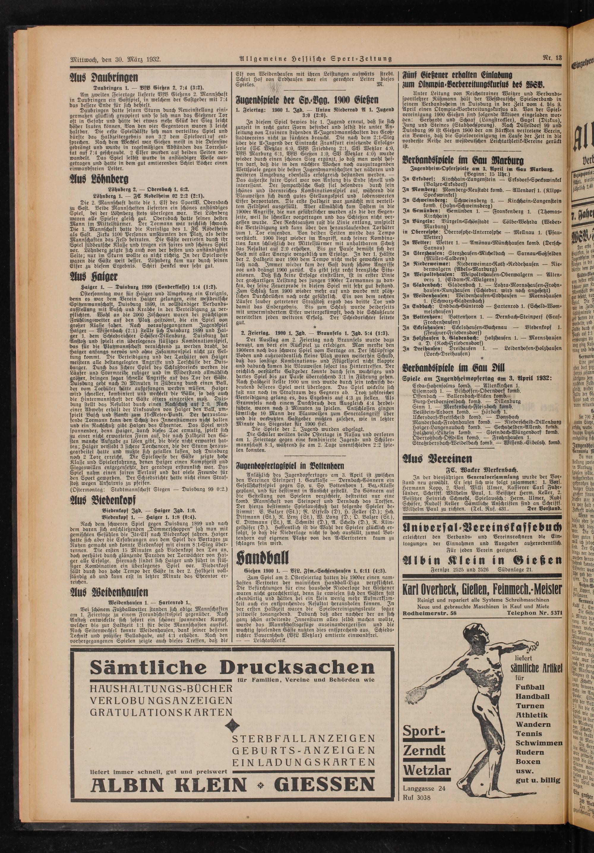 Spiele am Jugendheimopfertag am 3. April 1932: Erda⸗Hohensolms komb.— Altenkirchen 1. Eisemroth 1.— Bischoffen⸗Oberndorf komb. Offenbach— Ballersbach⸗Bicken komb⸗ Burg⸗Herbornseelbach komb.— Dillenburg Sinn 1.— Merkenbach⸗Fleisbach komb. Beilstein⸗Arborn komb.— Hörbach 1. Ucbersdorf⸗Breitscheid komb.— Donsbach Manderbach⸗Frohnhausen komb.— Niederscheld⸗Dillenburg Haiger⸗Langenaubach komb.— Sechshelden⸗Allend. komb. Ober zob bach Bd komb.— Stein bach⸗Würgendorf komb.