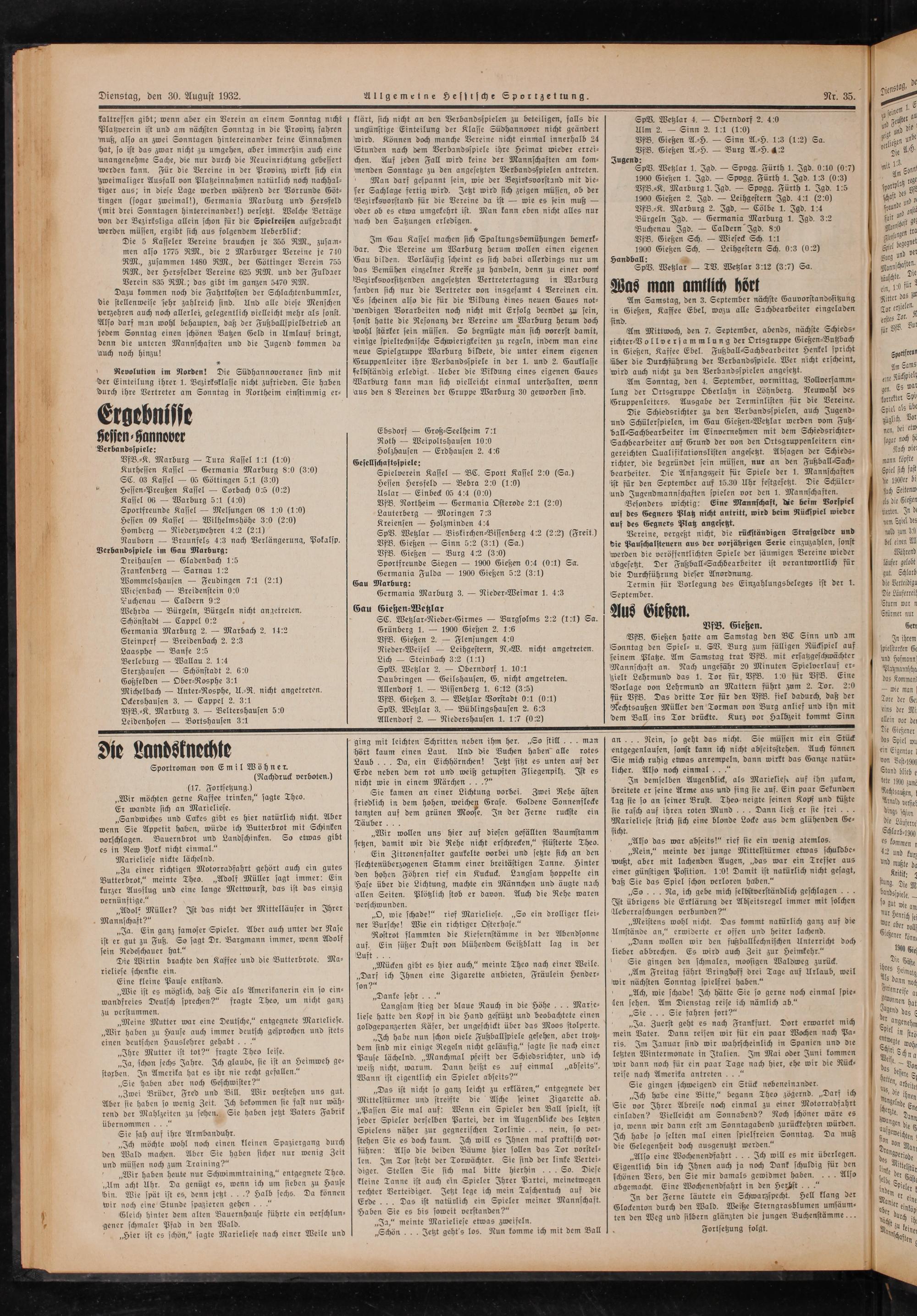 Verbandsspiele: VfB.⸗K. Marburg— Tura Kassel 1:1(1:0) Kurhessen Kassel— Germania Marburg 820(3:0) SC. 03 Kassel— 05 Göttingen 571(3:0) 1 Hessen-Preußen Kassel— Corbach 0:5(0:2) Kassel 06— Warburg 571(4:0) Sportfreunde Kassel— Melsungen 08 1:0(1:0) Hessen 09 Kassel— Wilhelmshöhe 3:0(2:0) Homberg— Niederzwehren 42(211) Nauborn— Braunfels 413 nach Verlängerung, Pokalsp. Verbandsspiele im Gau Marburg: Dreihausen— Gladenbach 115 Frankenberg— Sarnau 112