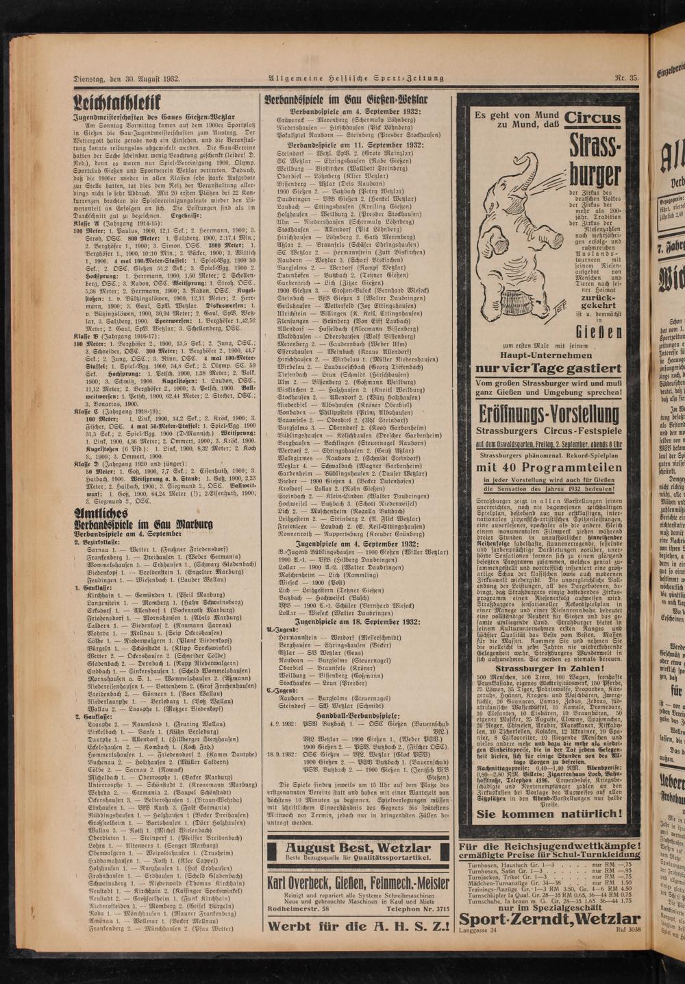 Verbandsspiele am 11. September 1932: Steindorf— Wetzl. SpV. 2.(Grote Mainzlar) SC Wetzlar— Ehringshausen(Rabe Gießen) Weilburg— Biskirchen(Wallbott Steinberg) Oberbiel— Löhnberg(Klier Wetzlar)