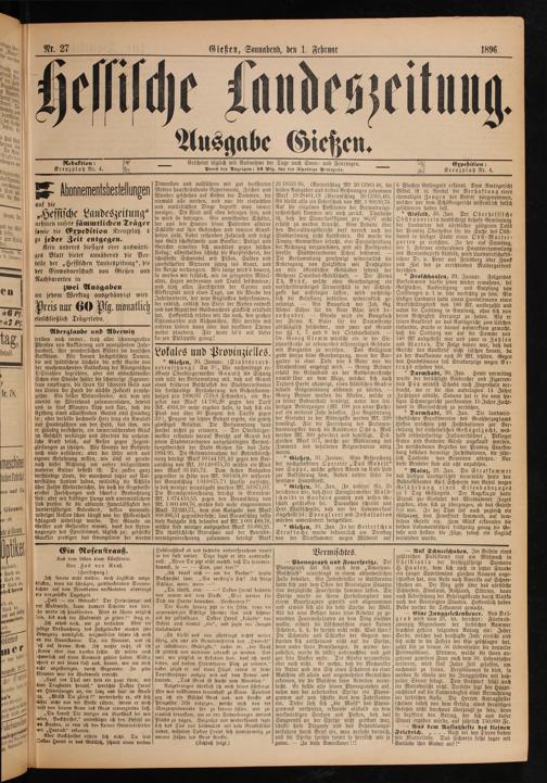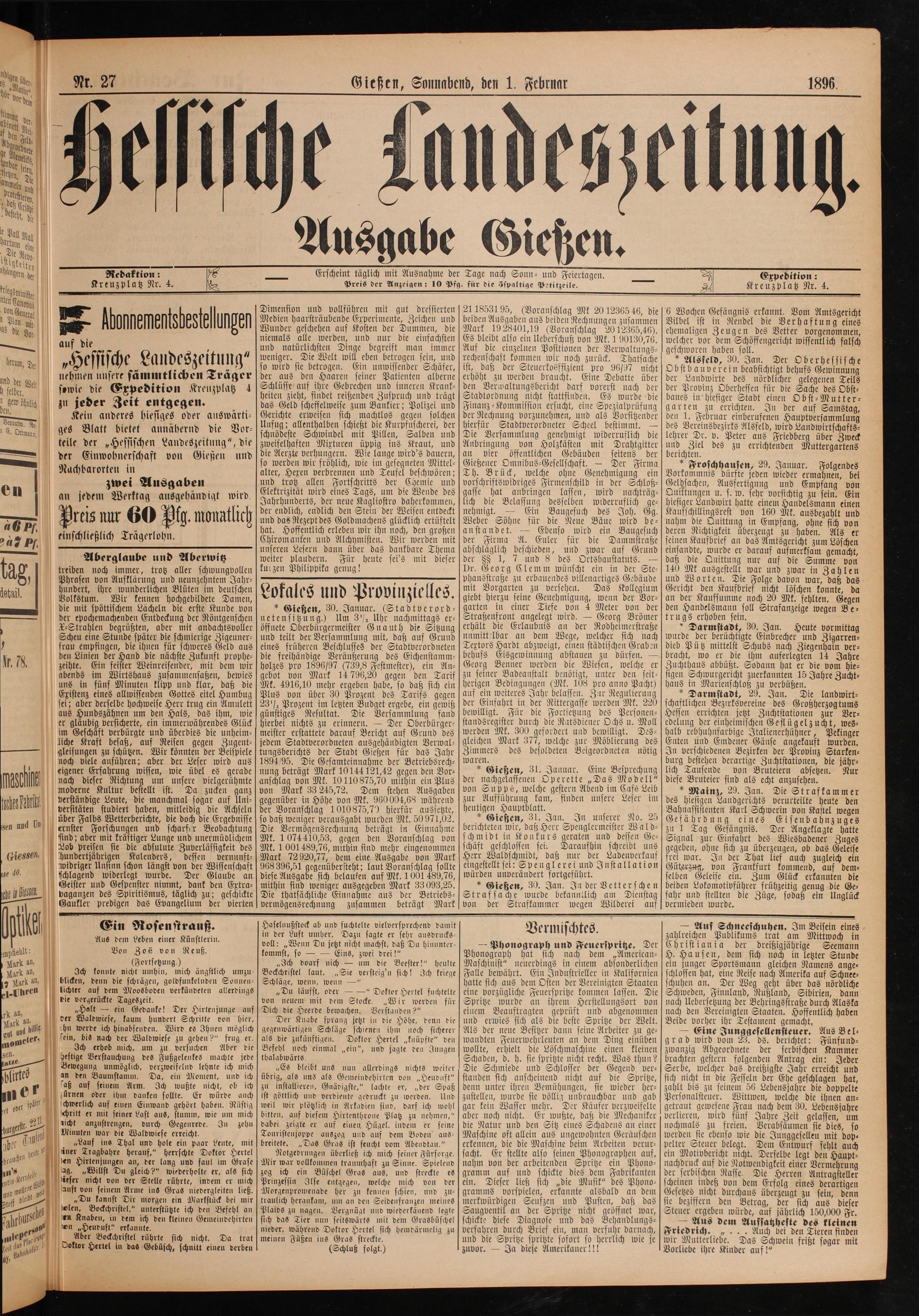 * Gießen, 30. Januar.(Stadtverord— netensitzung.) Um 3½ Uhr nachmittags er— öffnete Oberbürgermeister Gnauth die Sitzung und teilt der Versammlung mit, daß auf Grund eines früheren Beschlusses der Stadtverordneten die freihändige Veräußerung des Eichenstamm— holzes pro 1896/97(739,8 Festmester), ein An⸗ gebot von Mark 14 796,20 gegen den Tarif Mk. 4916,10 mehr ergeben habe, so daß sich ein Plus von über 30 Prozent des Tarifs gegen 23 ¼ Prozent im letzten Budget ergebe, ein gewiß günstiges Resultat. Die Versammlung fand hierbei nichts zu erinnern.— Der Oberbürger— meister erstattete darauf Bericht auf Grund des jedem Stadtverordneten ausgehändigten Verwal- tungsberichts der Stadt Gießen für das Jahr 1894/95. Die Gesamteinnahme der Betriebsrech—⸗ nung beträgt Mark 10144 121,42 gegen den Vor⸗ anschlag von Mk. 10 110 875,70 mithin ein Plus von Mark 33 245,72. Dem stehen Ausgaben gegenüber in Höhe von Mk. 960 004,68 während der Voranschlag 1010 875,7) hierfür aussetzte, so daß weniger verausgabt wurden Mk. 50 971,02. Die Vermögensrechnung beträgt in Einnahme Mk. 1 074 410,53, gegen den Voranschlag von Mk. 1001 489,76, mithin sind mehr eingenommen Mark 72 920,77, dem eine Ausgabe von Mark. 968 396,51 gegenübersteht; laut Voranschlag sollte diese Ausgabe sich belaufen auf Mk. 1001 489,76, mithin sind weniger ausgegeben Mark 33 093,25.