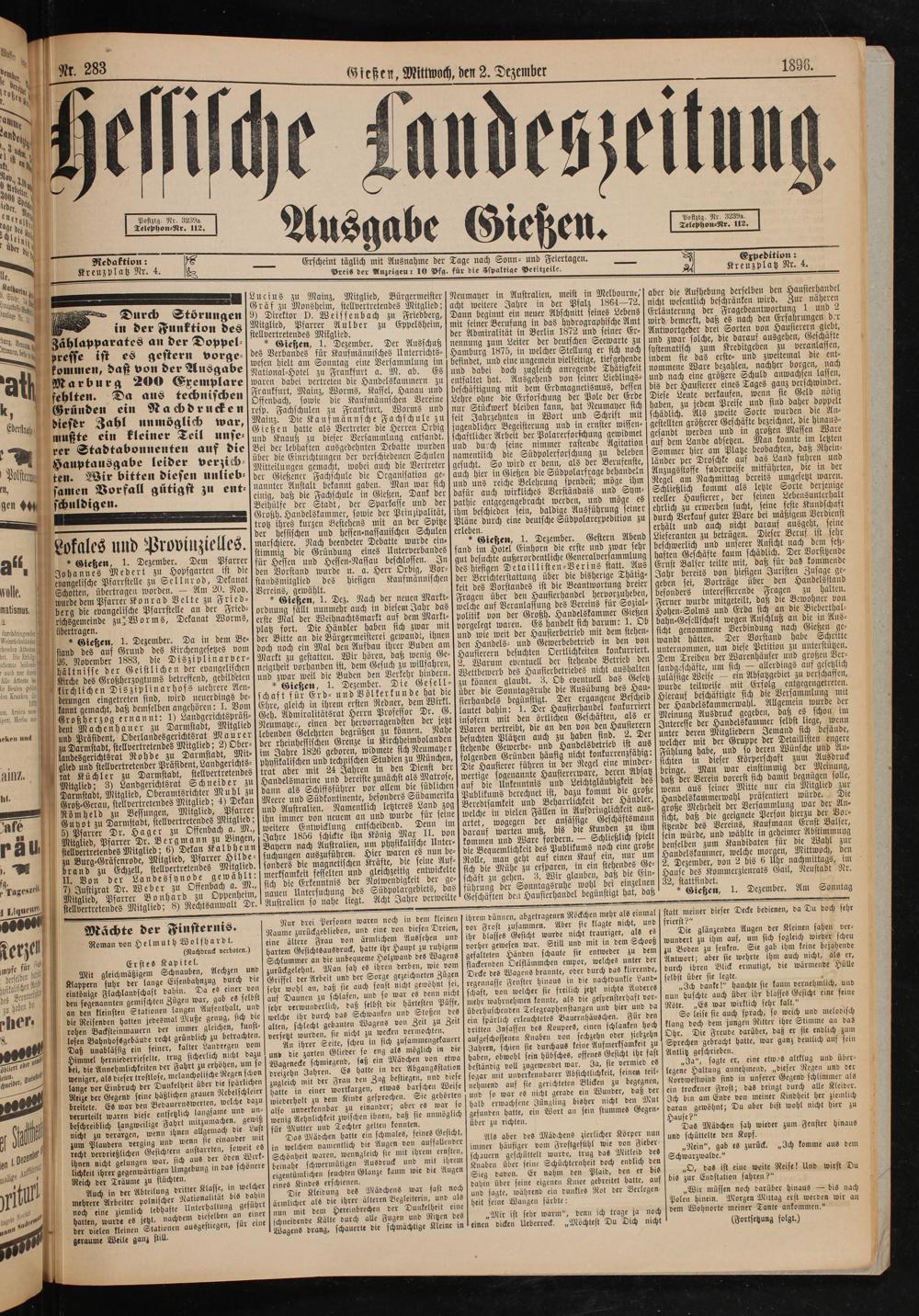 „Gießen, 1. Dezember. Dem Pfarrer Johannes Medert zu Hopfgarten ist die ebangelische Pfarrstelle zu Sellurod, Dekanat Schotten, übertragen worden.— Am 20. Nov. wurde dem Pfarrer Konrad Velte zu Fried⸗ berg die evangelische Pfarrstelle an der Fried⸗ kichsgemeinde zu- Worms, Dekanat Worms,